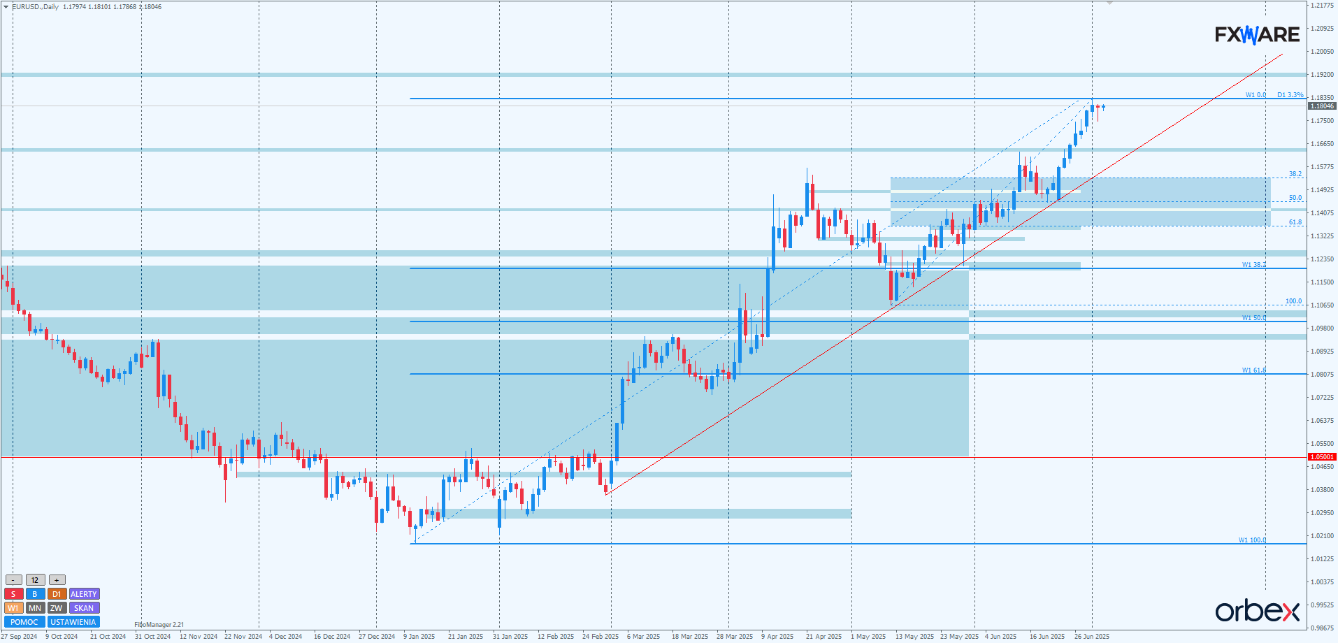 Na EURUSD trwa niezaburzony i jednorodny, jak na razie, swing wzrostowy w półrocznej już formacji wzrostowej. Pokonała ona sprawnie od dołu strefę wieloletniej konsolidacji i po reteście od góry jej górnej bandy w maju dorobiła się kolejnego impulsu. Wzrosty od połowy maja, choć nie tak szybkie jak te w marcu i kwietniu, sprawnie osiągają kolejne wieloletnie szczyty. Obecnie na D1 kurs zbliża się do górnej bandy strefy konsolidacji z 2021 roku. To poziom 1.19. Przy obecnym tempie byki mogą testować ten SR jeszcze w tym tygodniu. Na horyzoncie nie widać żadnych zagrożeń dla obecnej tendencji. Nawet niezbyt wybitne momentum fazy przyspieszonej aktualnego swingu nie jest niepokojące dla popytu. Niedźwiedzie musiałyby naprawdę dokonać spektakularnego pokazu siły i zamknięcia daily poniżej wielomiesięcznej LT i okolic pivota strefy zniesień fibo swingu mierzonego od majowych minimów, by można było mówić o zakończeniu tego trendu.