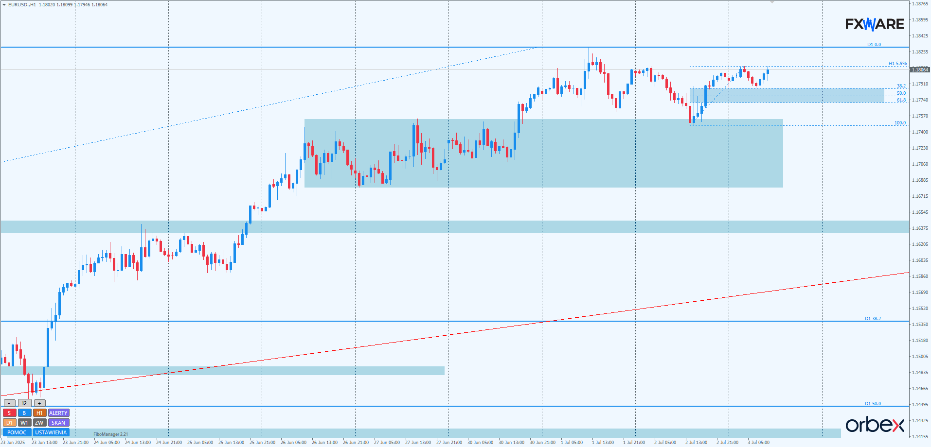 Na H1 również byczo. Wczoraj odbył się udany retest od góry górnej bandy strefy konsolidacji jeszcze z zeszłego tygodnia. Byki teraz będą zmagać się ze szczytami z wtorku i round numberem 1.18. Jeśli ten SR zostanie pokonany, kolejny silny impuls w górę nie będzie zaskakujący. Tylko zrodzenie się silnego momentum spadkowego od okolic, gdzie aktualnie przebywa cena, i pokonanie wczorajszych minimów zaburzyłoby tę byczą sielankę. Ale jak na razie podaż bez inicjatywy, by działać w tym kierunku.