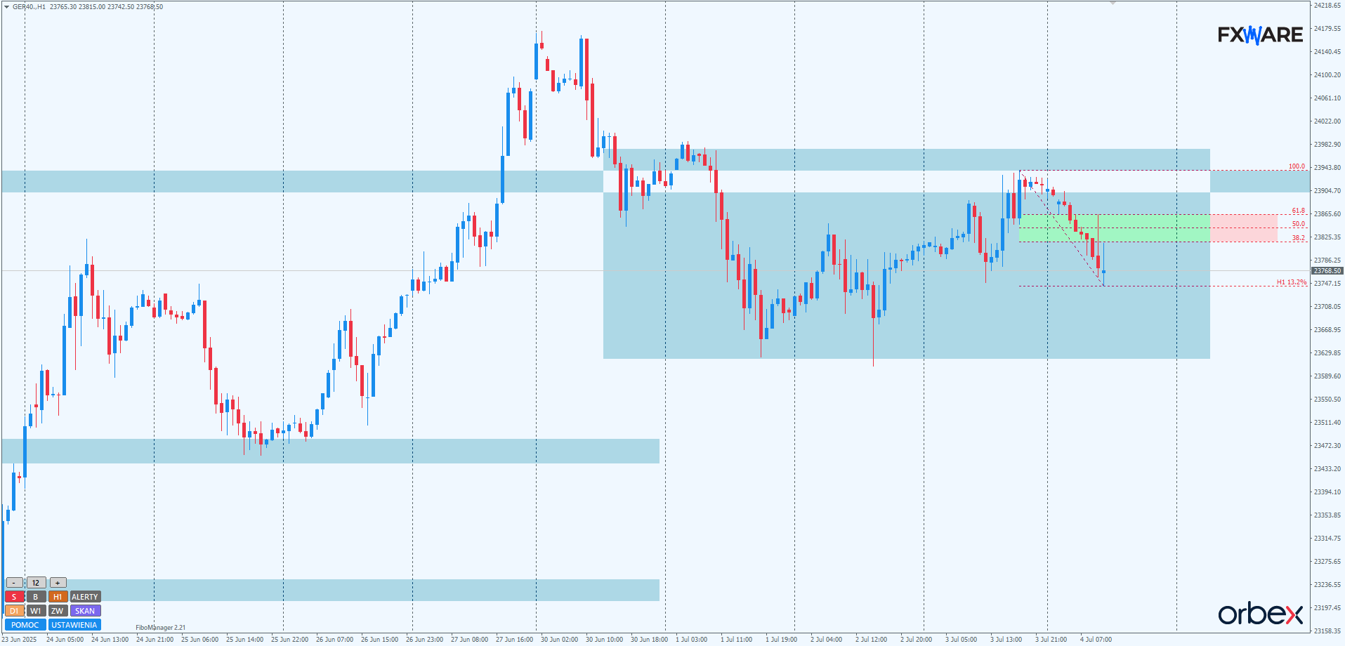 Na wykresie D1 DAX swing wzrostowy rozpoczęty na psychologicznym RN 23000 napotkał ewidentne trudności na poziomie zniesienia fibo 61,8. To, co jeszcze w poniedziałek zapowiadało się na gładki retest po przebiciu na sporym momentum, przeciągnęło się w kilkudniową korektę. Mało tego, ponowna próba rysowania impulsu przez popyt nie przyniosła wczoraj efektu w postaci przebicia tego zniesienia. Dziś od rana obserwujemy ponownie spadki. Jeśli dzisiejsze zamknięcie świecy dziennej będzie poniżej pivota tej strefy zniesień, będzie to poważny sygnał za tym, że być może byki nie są jeszcze na tyle mocne, by ponownie atakować ATH.