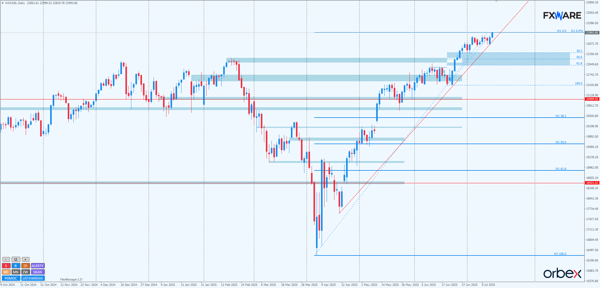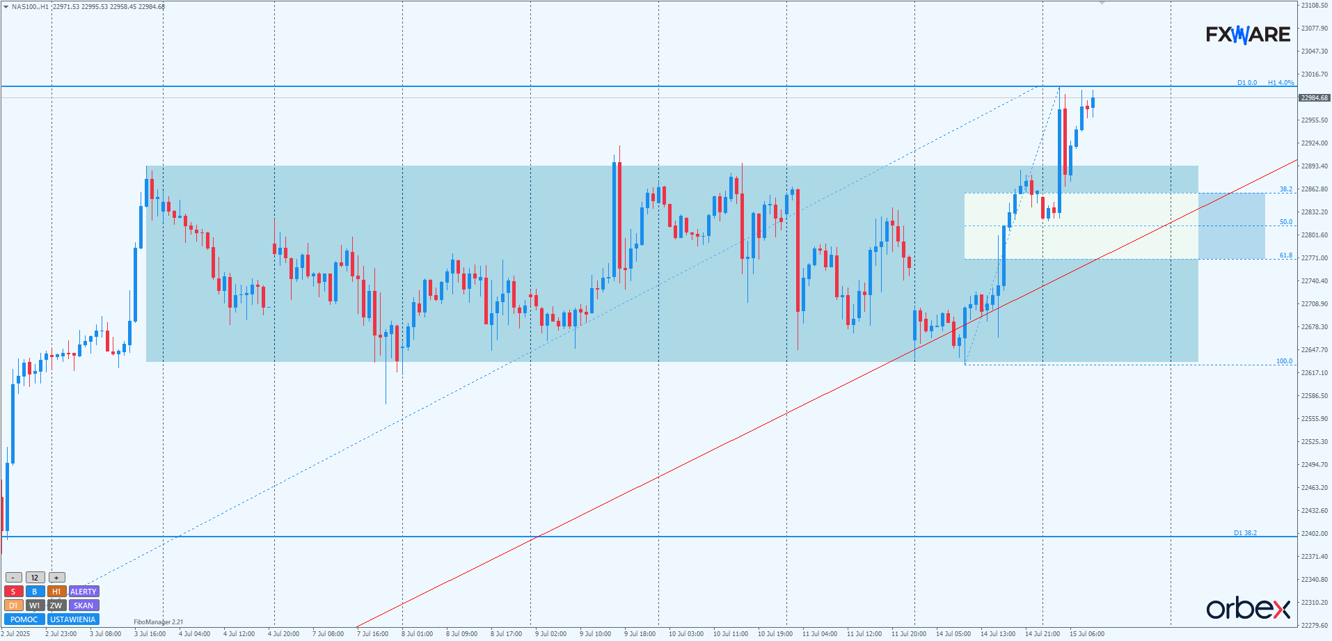 Na H1 dzisiejsze wyjście ze strefy konsolidacji ma nawet swój widoczny retest. Momentum co prawda nie było optymalne i we wczesnych godzinach porannych sprzyjało niedźwiedziom w głębszym zejściu w strefę zniesień Fibo, ale determinacja popytu okazała się spora i wycena indeksu już od 3 godzin oscyluje w okolicach dzisiejszych maksimów. Jeśli bykom z tego miejsca, bez korekty, udałoby się dokonywać coraz wyższych zamknięć w kolejnych godzinach, byłby to niezły pokaz siły i wzmacniałby scenariusz impulsowy na D1. W przypadku korekty należy zwrócić uwagę na okolice 22800, gdzie aktualnie przebiega pivot strefy zniesień Fibo swingu mierzonego od wczorajszych minimów i gdzie za parę godzin będzie przebiegać LT. Przy ewentualnym zejściu w te rejony taka konfluencja powinna wyindukować jakąś reakcję popytu, choć sporo w takim scenariuszu będzie zależało od momentum takiego ruchu. Jak na razie byki nie mają się jednak o co martwić.