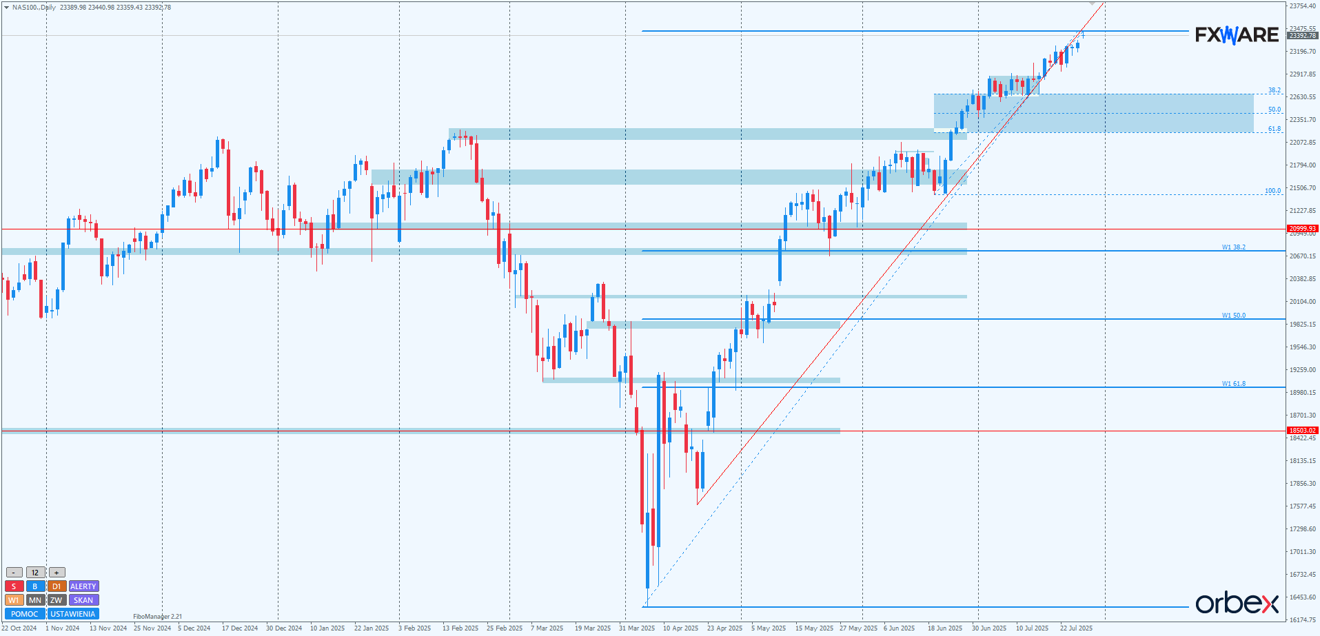 Na wykresie D1 Nasdaq ponownie ustanowił nowe All Time High. Choć momentum nie jest zbyt duże, to jednak nie można odmówić bykom uporu przez ostatnie dwa tygodnie w tym zakresie. Całość oscylacji ceny odbywa się w wąskim zakresie, lekko poniżej wielomiesięcznej LT. Otwarcie tego tygodnia nastąpiło z prowzrostową luką. Dzisiejsze zamknięcie pokaże, jak zostanie potraktowana — czy i w jakim zakresie będzie wybrana. Jak na razie jej obszar można traktować jako wspierający działania byków, chyba że zamknięcie dzisiejszej sesji wypadłoby poniżej 23200. Wtedy, niezależnie od wielkości knotów świecy daily, samo engulfowanie piątkowego body byłoby sygnałem osłabienia popytu. Przy niewielkiej rozpiętości body i wysokim otwarciu z luką, o taki scenariusz dzisiaj nie byłoby trudno.