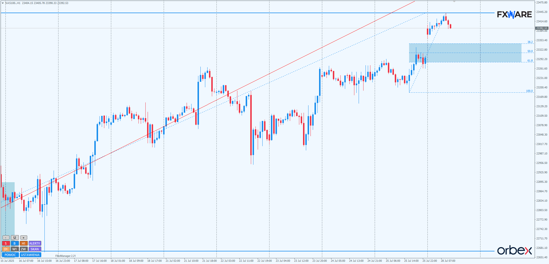 Na wykresie H1 aktualny swing w dół trwający od 3 godzin wydaje się, jak na razie, mieć większe momentum niż swing w górę od momentu otwarcia. Luka pokrywa się częściowo ze strefą zniesień Fibo pomiaru od piątkowych minimów. W okolicach jej poziomu fibo 61,8 przebiega górna banda blisko 2-dniowej strefy konsolidacji z czwartku i piątku. Nie byłoby więc niczym dziwnym, gdyby korekta w ciągu kilku do kilkunastu godzin osiągnęła ten poziom. Od ponownej reakcji popytu w okolicach 23280 — o ile korekta przeciągnęłaby się tak daleko — zależeć będzie, czy dzisiejsze maksimum będzie lokalnym szczytem na wiele dni, czy tylko kolejnym przystankiem, na którym byki nabierają sił przed kolejnym impulsem ustanawiającym kolejne ATH. Gdyby luka nie została wybrana, a korekta nie testowała strefy zniesień, takie nowe ATH mogłoby nastąpić w ciągu kilku godzin, a nie dni — jak w przypadku wariantu z korektą.