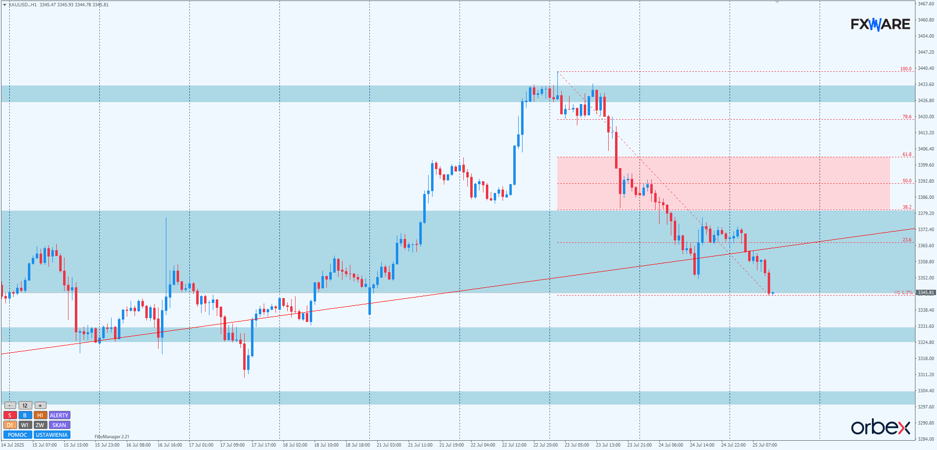 Na H1 przełamanie LT z wyższego TF staje się jeszcze bardziej widoczne. Przewaga niedźwiedzi z godziny na godzinę wydaje się uwidaczniać coraz bardziej. Całkowity brak reakcji popytu na spadki ze środy pokazuje skalę kapitulacji popytu. Jedyna w ciągu ostatnich 3 dni reakcja byków – wczorajszy popołudniowy engulf – przyniosła tylko wąską konsolidację na przełomie sesji i nic więcej. Kilka godzin temu został już zresztą zanegowany. Obecnie niedźwiedzie z rozpędem zmierzają w kierunku SR na 3327$. Jeśli utrzymają aktualne momentum, możliwy test tego poziomu już za 2–3 godziny. Gdyby podaż go pokonała, dotarcie do psychologicznego round numbera 3300$ w przyszłym tygodniu staje się coraz bardziej prawdopodobne.