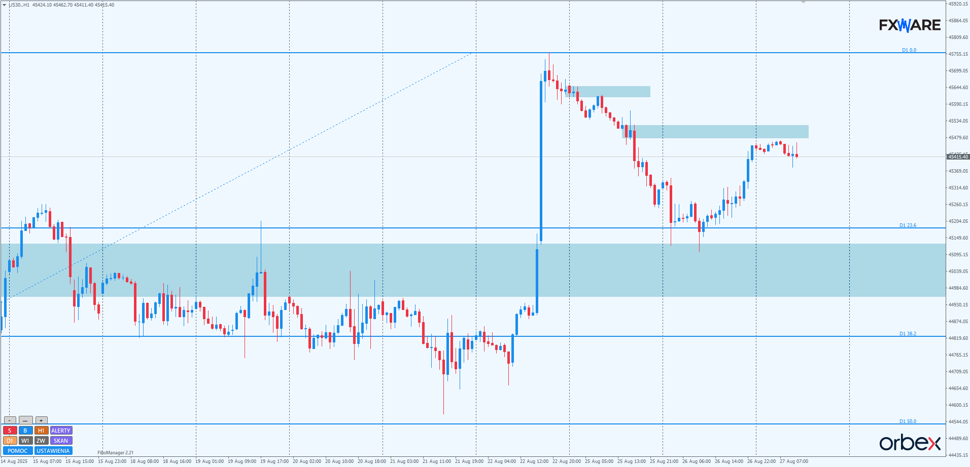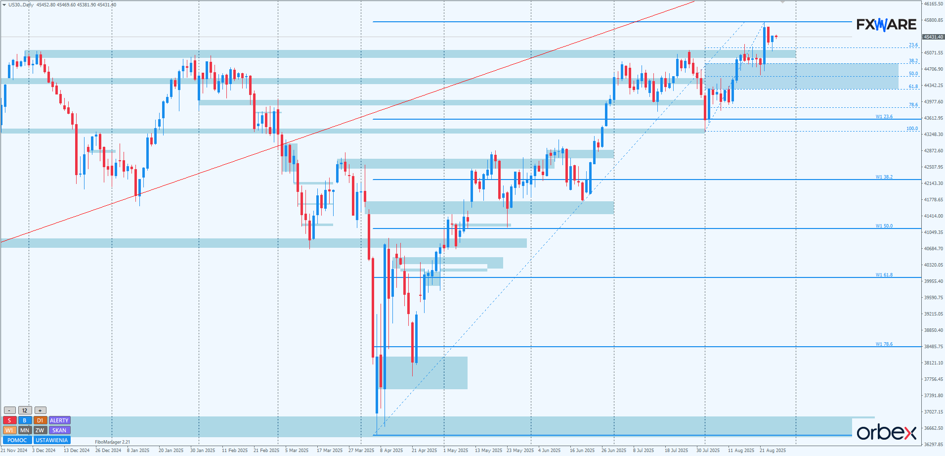 Po wybiciu na nowe ATH na wykresie d1 rozpoczęła się w poniedziałek korekta. Dotarła ona w okolice psychologicznego RN 45000, który zachował się zgodnie z ZZB. Efektem czego wczorajsza świeca dzienna uzyskała formę pro-wzrostowego pinbara. Cała blisko 5-miesięczna formacja wzrostowa jest niezagrożona, podobnie jak blisko miesięczna jej przyspieszona faza. W przypadku gdyby byki w kolejnych dniach nie dały rady ustanawiać nowych ATH, a wzrosty odbywały się na słabym momentum, możliwe będzie odreagowanie bliżej strefy zniesień fibo swingu mierzonego od minimów z przełomu miesiąca. O ile nastąpi ono na rozpędzie mniejszym niż ostatnie dwa impulsy wzrostowe, a niedźwiedzie nie uzyskają zamknięć dziennych poniżej 44300, byki nie mają się o co martwić.