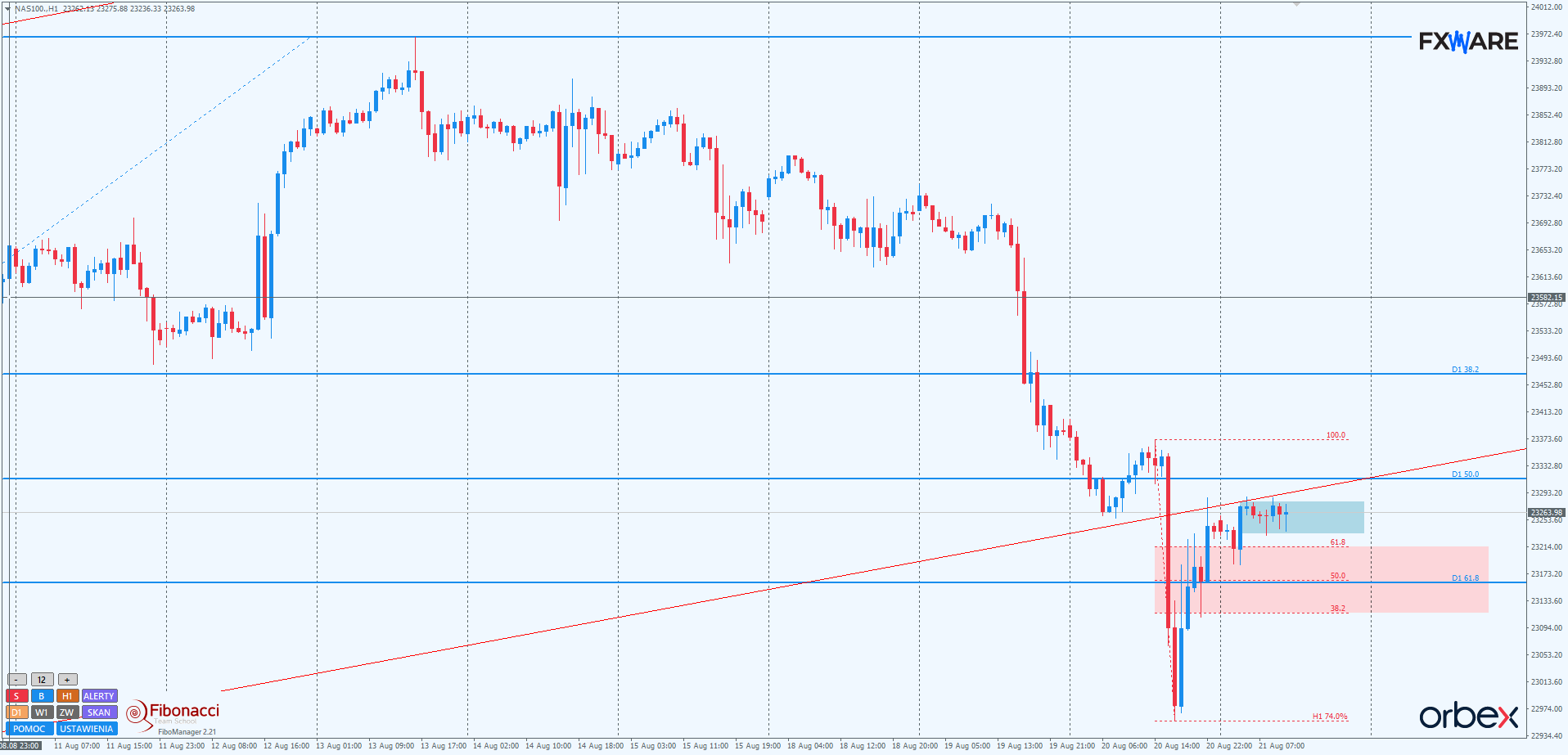 Na H1 trwa od kilku godzin wąska konsolidacja kończąca chwilowo korektę wczorajszego mini-tapnięcia. Ponad tygodniowy trend spadkowy nie jest zagrożony. Podaż ma dogodne z punktu widzenia momentum warunki do rysowania swojego impulsu i wyjścia dołem. Z kolei na korzyść byków przemawia sprawne pokonanie poziomu fibo 61,8 i mimo wszystko bardzo silne momentum w odpowiedzi na poziomie RN 23000. Najbliższe godziny powinny przynieść już rozstrzygnięcie. Nie tyle samo wyjście z aktualnej wąskiej konsolidacji będzie istotne dla dalszych losów swingu, co rozpęd, na jakim ono nastąpi. Silne wybicia, czy to w górę, czy w dół, uczynią ze strefy aktualnej konsolidacji problematyczne do pokonania wsparcie/opór dla przeciwnej strony.