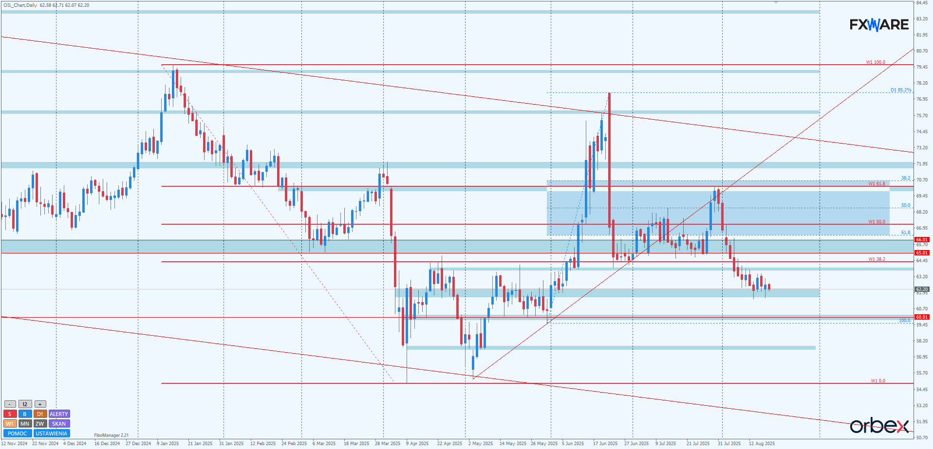 Na H1 ataki od góry na RN 62$ są wyraźnie widoczne. Samo jednak przekroczenie tego poziomu od góry w ciągu ostatnich dni było tylko epizodyczne, w obu przypadkach nie dłuższe niż 4h. Dodatkowo wczorajsza reakcja byków była gwałtowna i wywindowała cenę na nowy szczyt dnia. To sprawia, że swing w dół trwający dzisiaj ma jak na razie mniejsze momentum względem wczorajszej akcji obronnej popytu. Stawia to byki w dogodniejszej sytuacji do wyrysowania impulsowego ruchu w górę z celem ponad wczorajszymi maksimami. Sporo będzie zależeć od tego, jak RN 62$ będzie broniony i czy przypadkiem nie nastąpi jego wyłamanie z przyspieszeniem. Trzeci atak na sporym momentum na minima ostatnich miesięcy mógłby być nie do przetrzymania dla byków. Symptomem uzyskiwania przewagi przez niedźwiedzie w tym rejonie będzie uzyskanie zamknięcia H1 poniżej poziomu fibo 61,8 strefy zniesień swingu mierzonego od wczorajszych minimów.