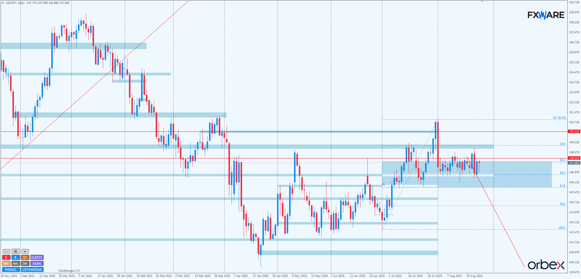 Na wykresie dziennym Jena konsolidacja w okolicach poziomu fibo 38,2 trwa. Od początku miesiąca cena wychodziła poza jej bandy tylko incydentalnie, w formie false breaków. Jej dolną bandę można zidentyfikować na poziomie 146.700, a górną w okolicach 148.300. Obie strony mają już za sobą udane obrony poważnych prób wybicia – byki w postaci knota pro-wzrostowego pinbara z 14 sierpnia, a niedźwiedzie w postaci engulfa z piątku. Pod względem momentum sytuacja minimalnie bardziej sprzyja podaży. Cała 4-miesięczna sekwencja to jak na razie korekta marcowych spadków, do tego silne marubozu z początku miesiąca ledwo zostało naruszone – nie ma mowy o jego negacji. Nie jest to jednak znacząca przewaga w obliczu tak długiej konsolidacji.