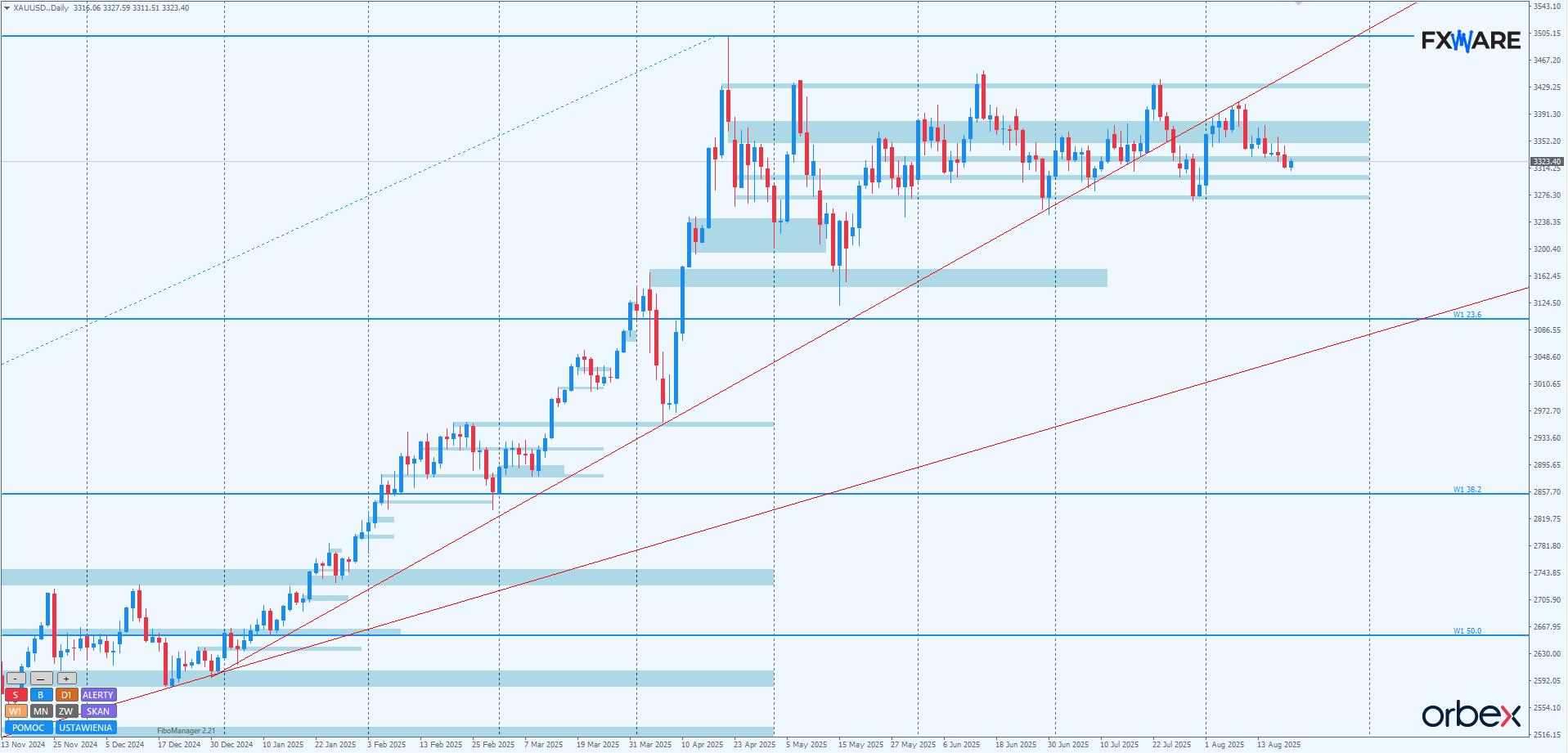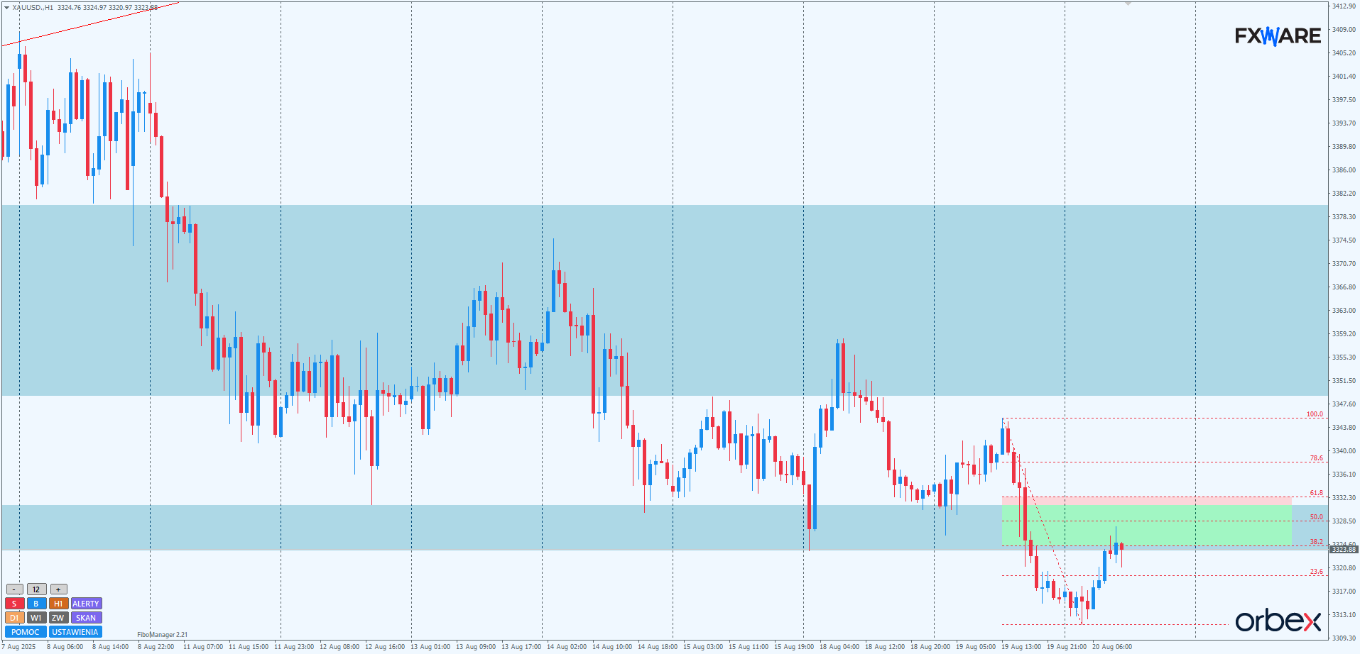 Poziomy zniesień Fibonacciego, zostały automatycznie naniesione za pomocą wskaźnika FiboManager. Jest on także dostępny gratis dla traderów Orbex. Warunkiem jest posiadania aktywnego konta.
