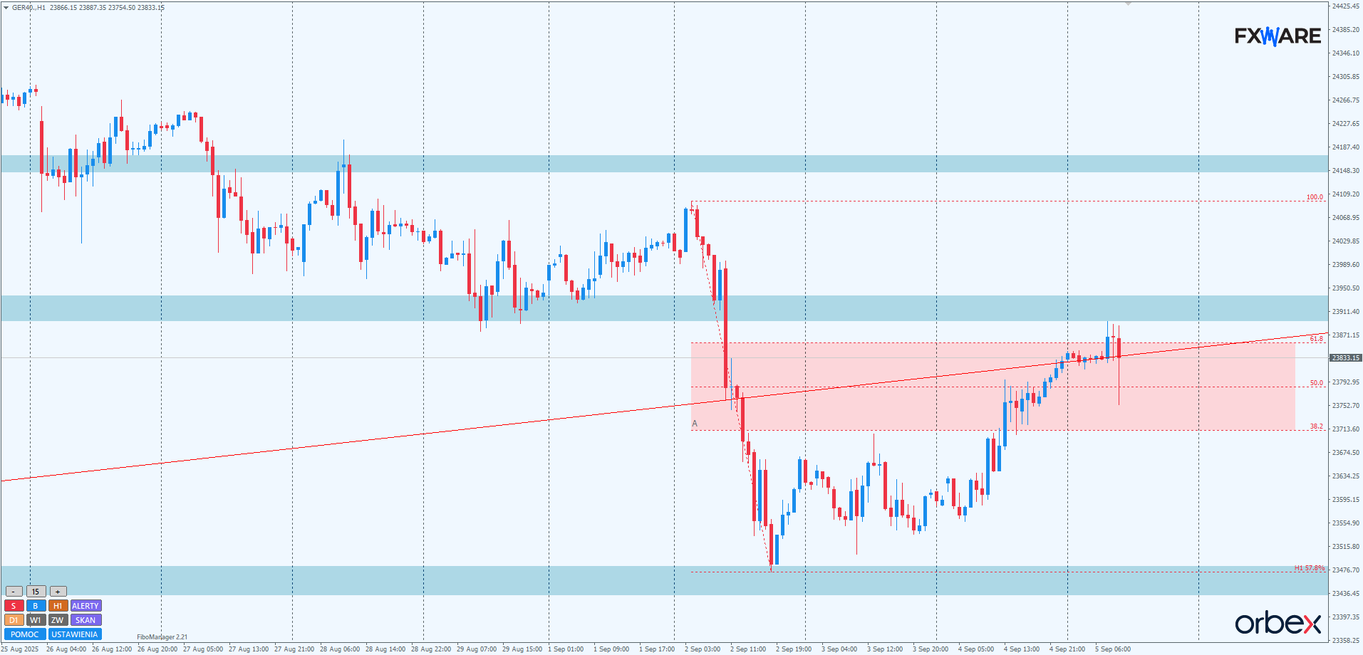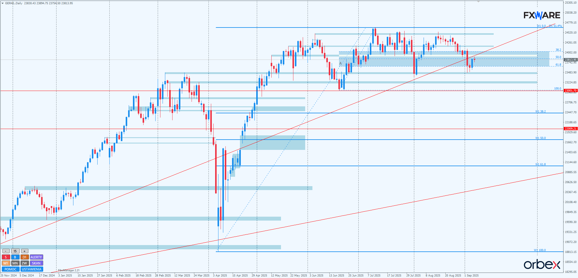 Na wykresie dziennym DAX po ponownej reakcji na poziomie fibo 61,8 byki rozpoczęły rysowanie swojego swingu w górę. Jest on korekcyjny względem sporej spadkowej świecy z wtorku. Jak na razie momentum odpowiedzi byków jest mniejsze. Ale to zamknięcie dzisiejszej świecy daily pokaże, czy wystarczające do osiągnięcia strefy konsolidacji, od której zaczął się ostatni spadek. Leży ona w okolicach RN 24000 i pokrywa się z poziomem fibo 38,2 swingu mierzonego od majowych minimów. Będzie to jedno z ostatnich dogodnych dla niedźwiedzi miejsc do shortowania i tym samym rysowania nowego swingu impulsowego w dół, by zachować przyspieszającą strukturę spadkową z początkiem w połowie sierpnia. Zamknięcie daily powyżej RN 24000 dzisiaj i jeszcze w poniedziałek może uczynić ze spadkowej fazy trwającej od początku miesiąca false breaka, podobnie jak miało to miejsce na początku sierpnia.