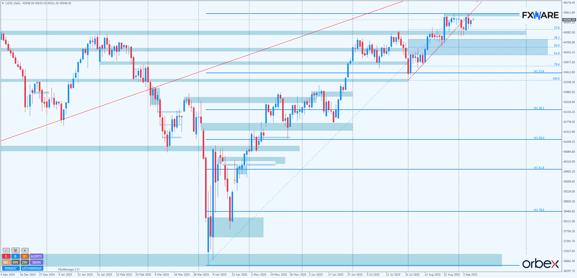 Na wykresie dziennym Dow Jones w piątek zdołał zaledwie wyrównać ostatnie ATH. Brak wyraźnego zamknięcia ponad 45740 zaowocował swingiem w dół i wyraźniejszym ukonstytuowaniem strefy konsolidacji. Znajduje się ona pomiędzy SR związanym z ATH a SR na psychologicznym RN 45000. Dzisiejsza i jutrzejsza sesja pozwolą ocenić, czy momentum w jedną ze stron jest bardziej klarowne. Gdyby okazało się słabe, impuls w dół podobny do tego sprzed dwóch dni, w związku ze zmianą rozpędu byków, nabrałby większego prawdopodobieństwa. Cała sytuacja, pomimo trwającej konsoli, jest mimo wszystko w średnim i długim terminie sprzyjająca dla popytu. Sekwencja byków trwająca już blisko pół roku nie jest zagrożona. Nawet głębsza, wielodniowa korekta w kierunku strefy zniesień fibo swingu mierzonego od minimów z początku sierpnia nie zmieniłaby tego obrazu.