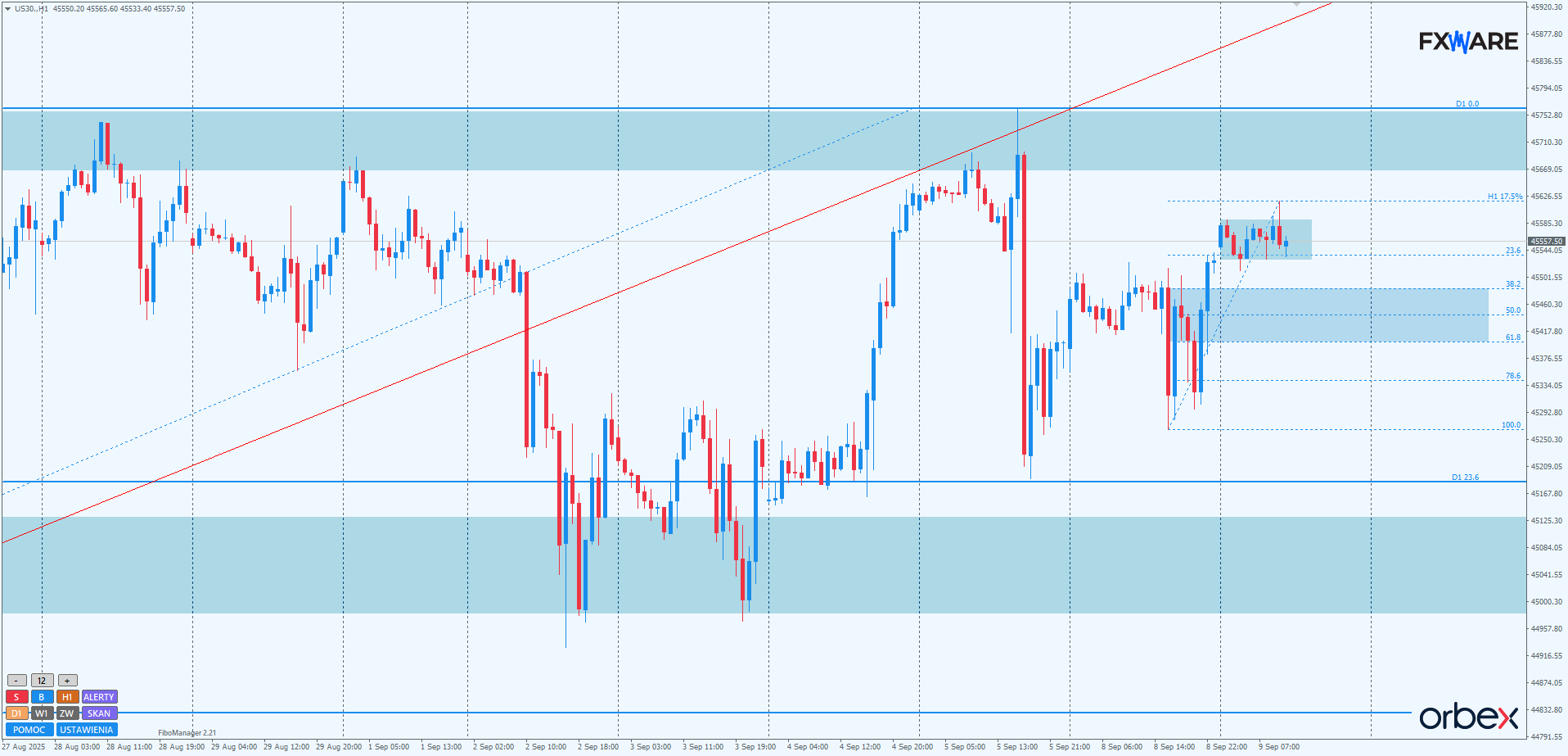 Na wykresie h1 typowe dla wąskich konsolidacji szybkie zmiany momentum. Piątkowa negacja wysiłku byków po wczorajszej korekcie nie przyniosła ustanowienia nowego niższego dołka i wyjścia z konsoli dołem. Po południu aktywował się popyt, który po wyrysowaniu lokalnego double bottoma wywindował kurs DJ na maksima dnia. Dziś od rana wąska konsolidacja w okolicach 45600. Do momentu opuszczenia strefy najpierw lokalnej, wąskiej konsolidacji, a w perspektywie kilku–kilkunastu godzin tej większej, widocznej na wykresie dziennym, obie strony mają szanse na wyprowadzenie decydującego dla siebie swingu. Na korzyść podaży działa to, że cena ciągle pozostaje w obszarze piątkowego mini tąpnięcia, co daje niedźwiedziom wciąż korzystne miejsce do ponawiania shortów. Na korzyść popytu przemawia ostatnia aktywność i odzyskanie inicjatywy w zakresie momentum, które nastąpiło wczoraj, oraz leżąca pod ceną strefa zniesień fibo swingu mierzonego od wczorajszych minimów. Bez uzyskania dodatkowego przyspieszenia przez podaż będzie ona ciężka do sforsowania na dzisiejszej sesji.