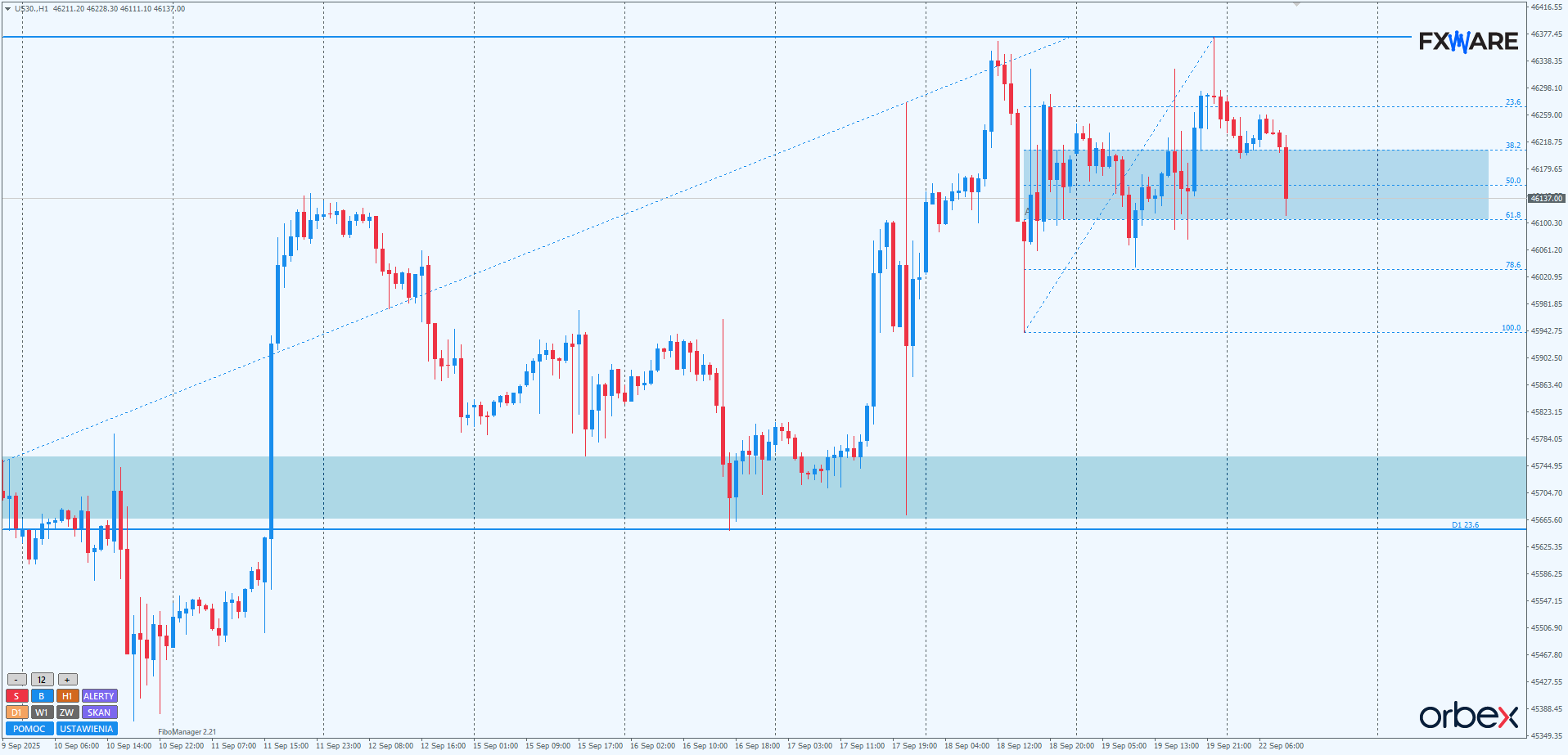 Poziomy zniesień Fibonacciego, zostały automatycznie naniesione za pomocą wskaźnika FiboManager. Jest on także dostępny gratis dla traderów Orbex. Warunkiem jest posiadania aktywnego konta.