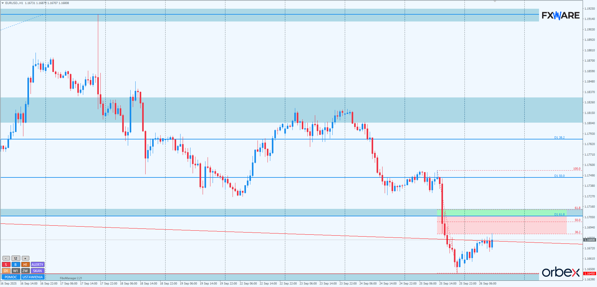 Na wykresie dziennym EURUSD trwa drugi swing spadkowy w sekwencji rozpoczętej od prospadkowego pinbara z 17.09. Niedźwiedzie ponownie sprowadziły kurs w okolice górnej bandy opuszczonego na początku miesiąca kanału. Przebiega tu również strefa konsolidacji z drugiej połowy sierpnia. Zwykle takie miejsca działają jak opory, o ile powrót do nich odbywa się na mniejszym momentum niż impuls wybijający. Tak też jest w tym przypadku. Z tym że momentum, jakie zaprezentowały przez ostatnie dwie sesje niedźwiedzie, jest na granicy uznania go za komfortowe do rysowania nowego impulsu w górę przez popyt.