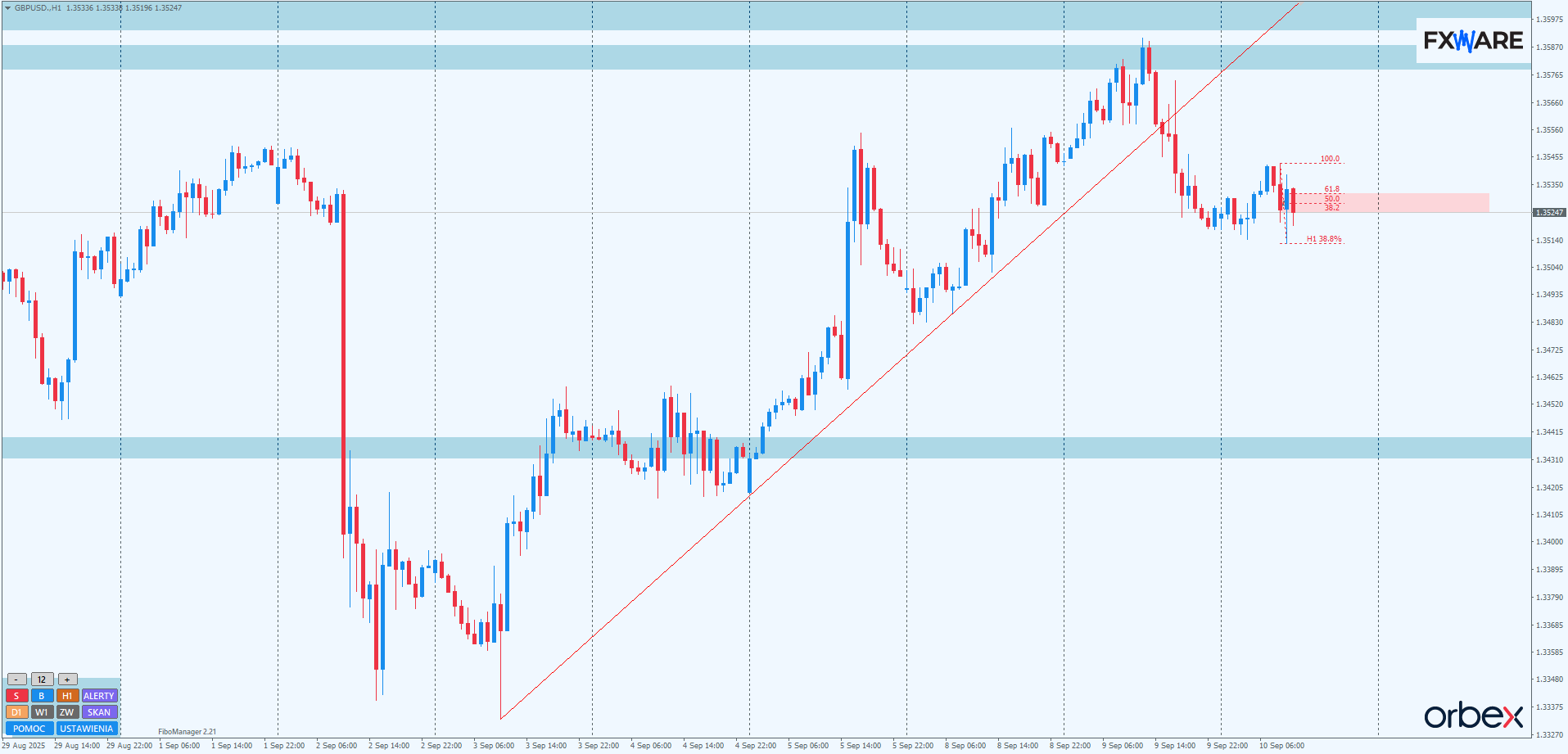 Na h1 efektem przedwczorajszego spowolnienia byków jest wyłamanie lokalnego, kilkudniowego trendu wzrostowego. Wczoraj pojawiło się przeciwne momentum, ale jak na razie nie jest kontynuowane. Dobrym potwierdzeniem będzie pobicie minimów z przełomu sesji i wczesnych godzin porannych. Szczególnie jeśli nastąpiłoby to na sporym momentum, to okolice 1.35270–1.35300 stałyby się oporem, który mógłby pomóc podaży w dalszym nabieraniu rozpędu na h1 i w konsekwencji rozpoczęcia wspomnianego impulsu w dół na wyższych TF.