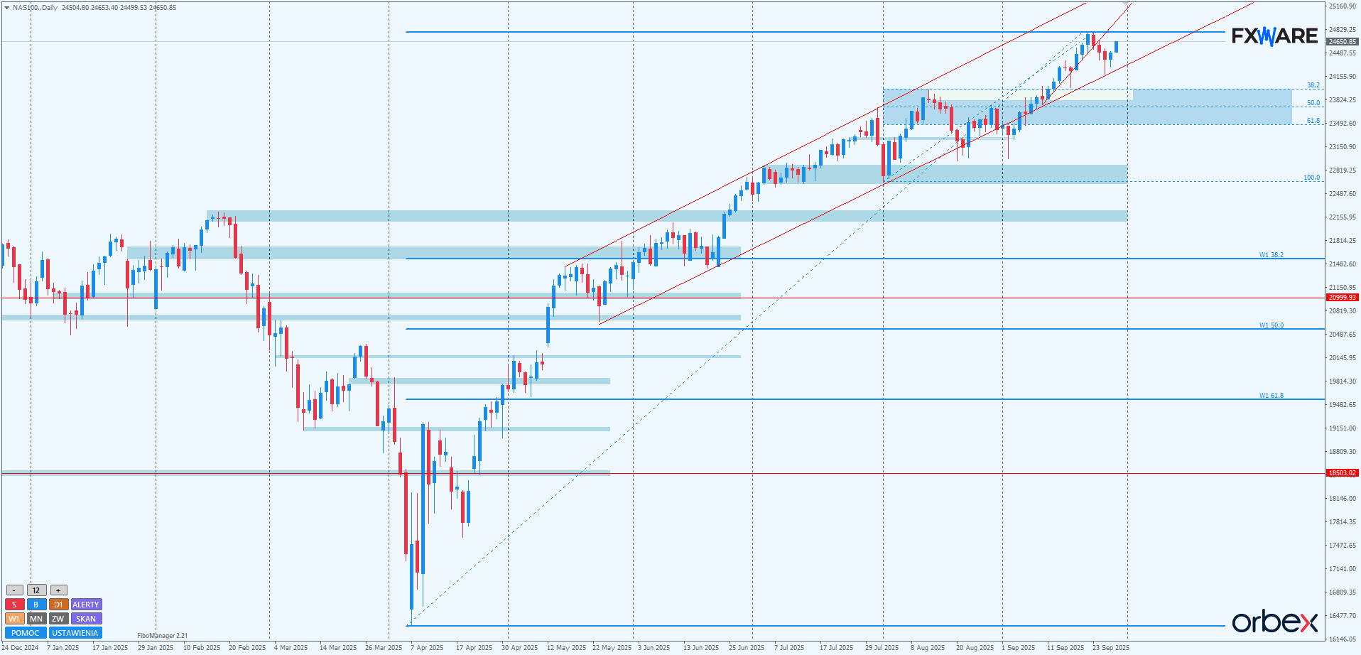 Od czasu powrotu do wielomiesięcznego kanału wzrostowego NASDAQ dwukrotnie z sukcesem przetestował jego dolną bandę. Ostatni taki test miał miejsce w czwartek i od tego czasu byki starają się wyrysować nowy impuls w górę. Od początku tego tygodnia idzie im bardzo dobrze i jeśli takie momentum utrzyma się jeszcze kilkanaście godzin, to ustanowią nowy wyższy szczyt w dotychczasowej sekwencji i tym samym nowe ATH. W przypadku braku mobilizacji podaży psychologiczny round number 25000 ma szansę pojawić się na liczniku jeszcze w tym tygodniu. Cały 6-miesięczny trend nie jest w żaden sposób zagrożony. Nawet kilka do kilkunastu dni spadków, o ile nastąpiłyby na małym momentum, nie zmieni tej korzystnej dla byków sytuacji.