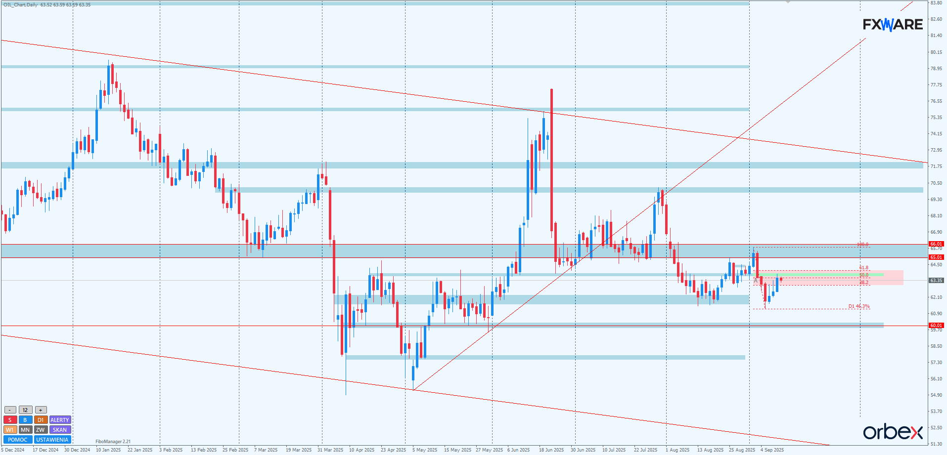 Za wcześnie jeszcze, by mówić o zagrożeniu aktualnej struktury spadkowej, ale jeśli byki utrzymają rozpęd, to ponowny test 65-66$ jest realny nawet do końca tego tygodnia. Byłoby to co najmniej zaburzenie w dotychczasowej, ponad 2-miesięcznej sekwencji. Byki mają nad sobą przeszkody pod postacią SR na 63.70$ oraz poziomu fibo 61,8 wspomnianej strefy zniesień. Są to optymalne miejsca dla podaży do ponownej aktywizacji. Najbliższe 2-3 sesje powinny przynieść już wyjaśnienie w kwestii reakcji na to miejsce i tym samym dalszych losów aktualnej sekwencji spadkowej.