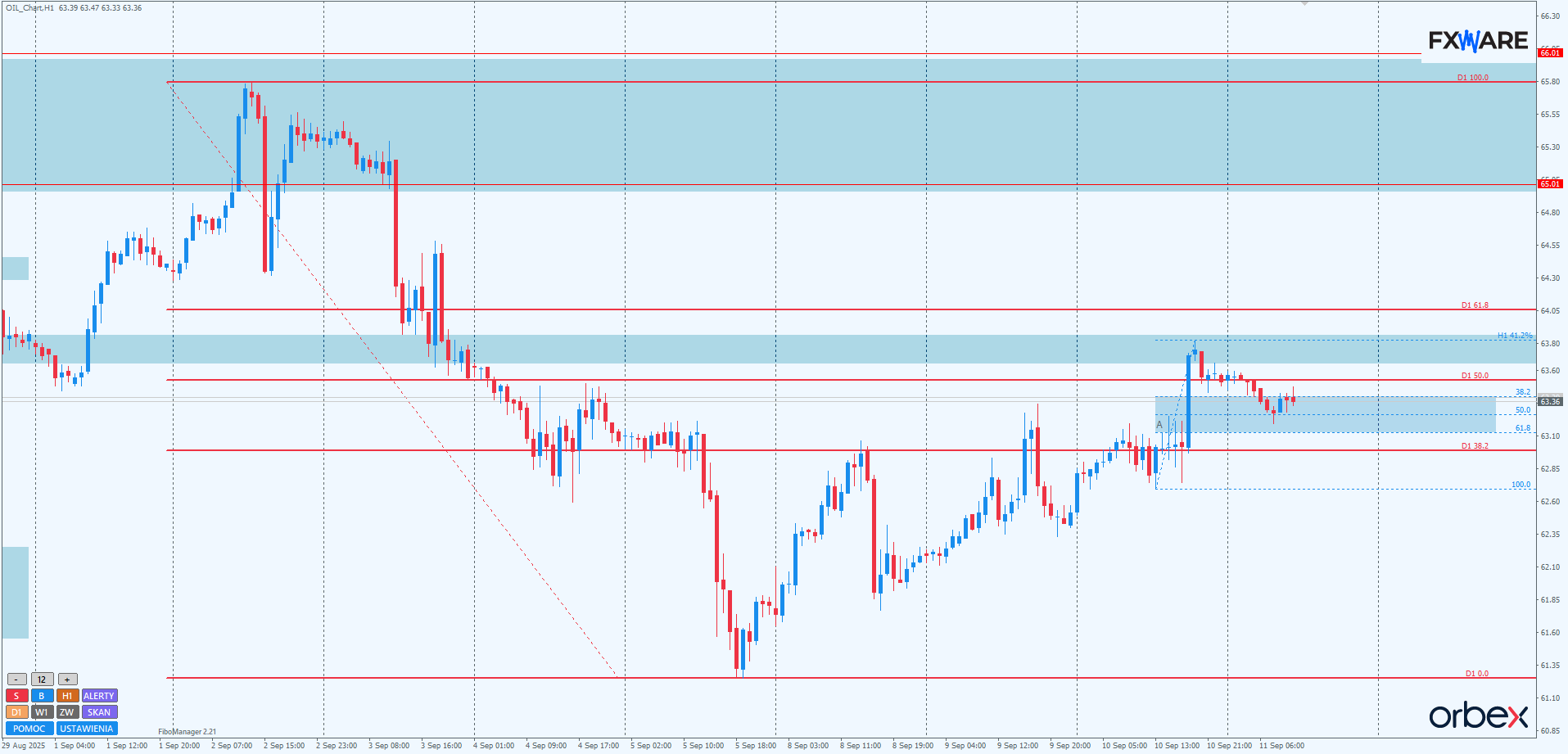 Na h1 sytuacja wczoraj zmieniła się na bardziej korzystną dla byków. Pobicie szybkim ruchem kilkudniowych maksimów wskazuje na ponowne przejęcie inicjatywy przez popyt. Co ważniejsze, reakcja i korekta do dzisiejszego poranka przebiegła spokojnie i na dużo mniejszym momentum niż wczorajsze wybicie w górę. Daje to bykom komfortowe warunki do rysowania kolejnego impulsu w okolicach 63.0-63.1$. Dodatkowo RN 63$ jest teraz wsparciem działającym na korzyść byków zgodnie z zasadą ZZB. Tylko jego ponowne pokonanie od góry i przetestowanie wczorajszych minimów mogłoby zmienić obraz tej sytuacji ponownie na niekorzyść popytu.
