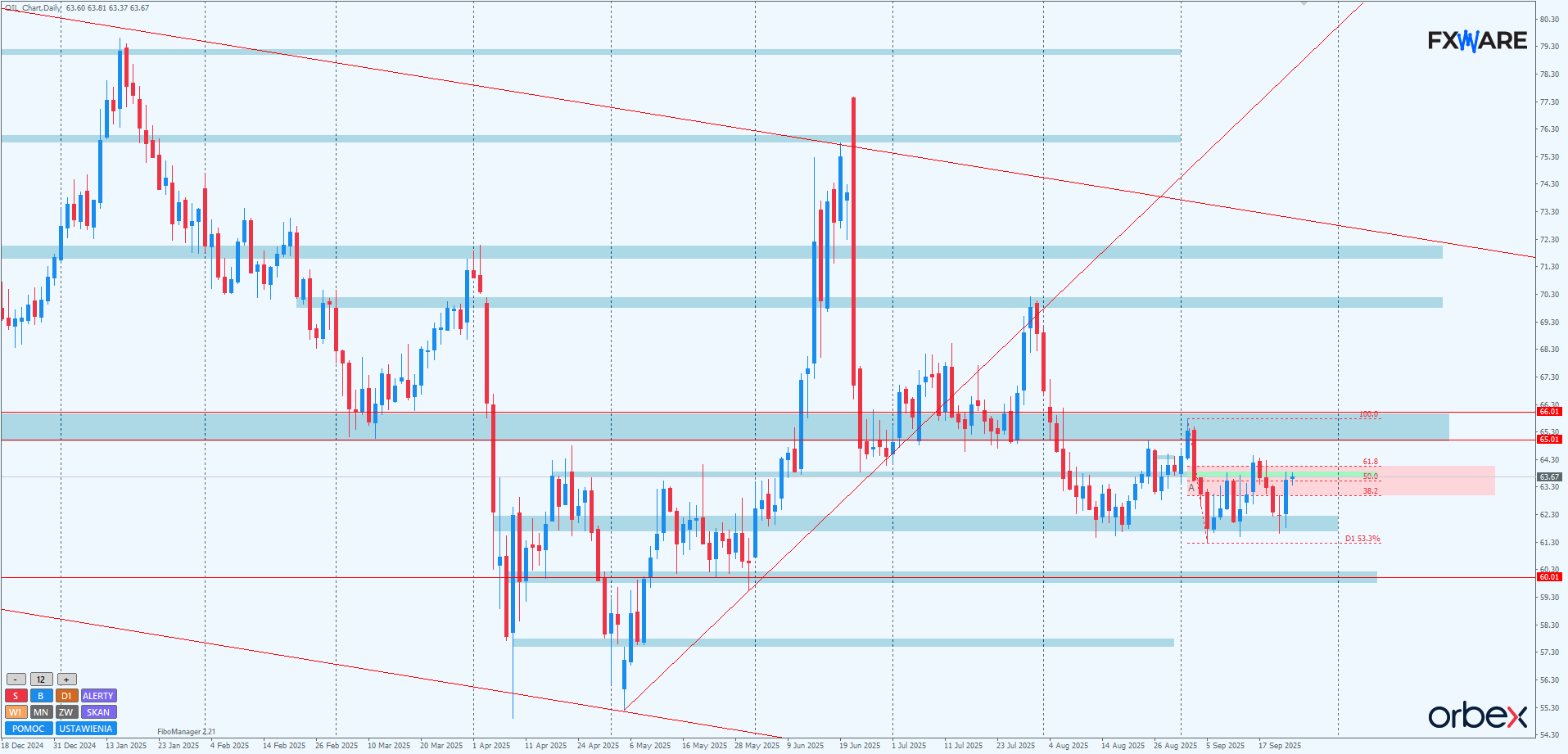 Na h1 przewaga byków jest jeszcze bardziej widoczna. Widać, że wczorajsze wzrosty w formie silnego impulsu nie tylko przeniosły walkę piętro wyżej do SR w okolicach 63,70$, ale impet, z jakim byki to zrobiły, bezdyskusyjnie zanegował dość mocny poniedziałkowy swing w dół. Dzisiaj po niewielkiej korekcie na przełomie sesji wydaje się, że momentum będzie kontynuowane. Jedynym, co mogłoby zagrozić bykom, jest nagła mobilizacja podaży. Niedźwiedzie musiałyby w ciągu kilku godzin uzyskać zamknięcia w okolicach fibo 61,8 strefy zniesień swingu mierzonego od poniedziałkowych minimów. Wszelkie wolniejsze spadki, nawet kilkunastogodzinne, nie zmienią korzystnej wymowy PA dla byków.