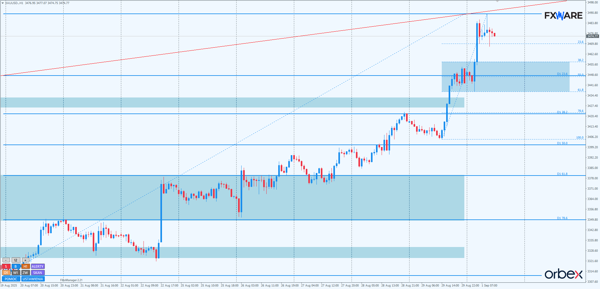 Na h1 jeszcze wyraźniej widać, jakiego wigoru nabrały byki. Piątkowy impuls nie doczekał się nawet retestu czwartkowych maksimów. Jedynie niewielka konsolidacja na przełomie sesji wystarczyła do kolejnego impulsu w wykonaniu popytu. Jak na razie nie widać żadnych większych zagrożeń dla kampanii byków. Być może pinbar sprzed 2 godzin przyniesie odreagowanie w kierunku strefy zniesień fibo swingu mierzonego od piątkowych minimów. Ale nawet wtedy wielodniowy trend nie będzie w żaden sposób zagrożony. Podaż musiałaby w ciągu kilku godzin uzyskać zamknięcia poniżej 3430, by rozważać jakąkolwiek zmianę sentymentu w krótkim czy średnim terminie. Tylko tak gwałtowne spadki wygenerowałyby odpowiednio duże momentum, które mogłoby negować wzrosty ostatnich dni. Wszelkie wolniejsze spadki, nieosiągające 3430, mają większe szanse indukować kolejne zakupy byków, czekających tylko na okazję teraz, gdy wyjście z wielomiesięcznej konsolidacji wydaje się bardziej klarowne.