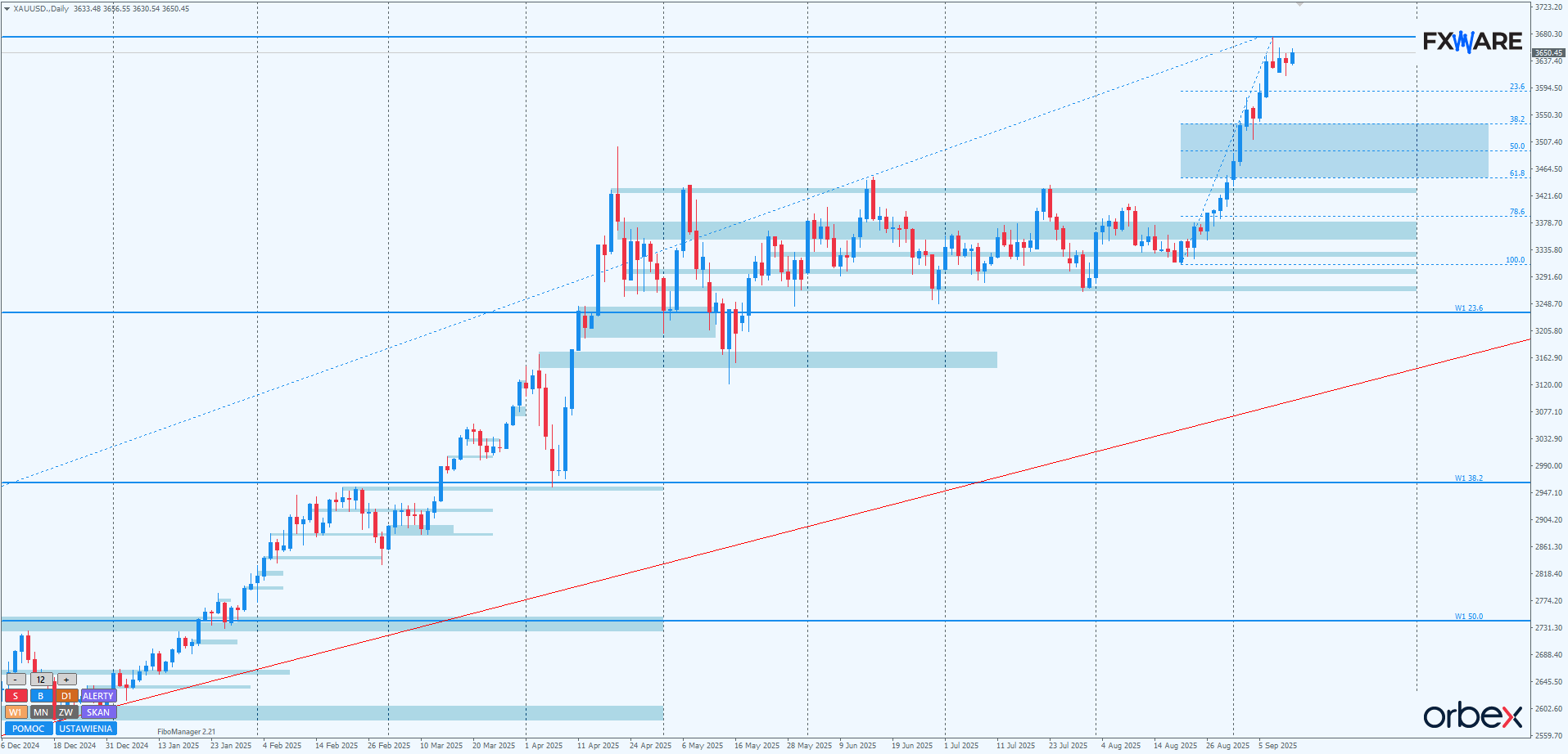 Na wykresie dziennym złota nadal nierozstrzygnięte są losy pro spadkowego pinbara z wtorku. Pomimo tego, że cena znajduje się w dość jednorodnym jeszcze swingu wzrostowym, jego lekko spowalniające działanie na byki staje się coraz bardziej widoczne. O ile popyt nie wykrzesa z siebie jakiegoś dodatkowego rozpędu, by jednoznacznie go zanegować poprzez uzyskanie zamknięcia świecy daily powyżej ostatniego ATH wyznaczonego przez czubek tego pina, scenariusz korekty ze szczytem we wtorek nadal musi być brany pod uwagę. W przypadku negacji wspomnianego pinbara dobrymi kandydatami do rozpoczęcia korekty w przyszłym tygodniu będą kolejne wyższe round numbery. Również zewnętrzne mierzenia fibo. Siedemnastosesyjny jak na razie lokalny trend, poza niebezpieczeństwami wynikającymi z niedawnego pinbara, nie jest zagrożony. Podobnie jak cała średnioterminowa, blisko roczna już sekwencja. Nawet kilkudniowe spadki w okolice 3500 nie będą poważnym zagrożeniem dla rozpędzonych byków, o ile nastąpią na umiarkowanym momentum.