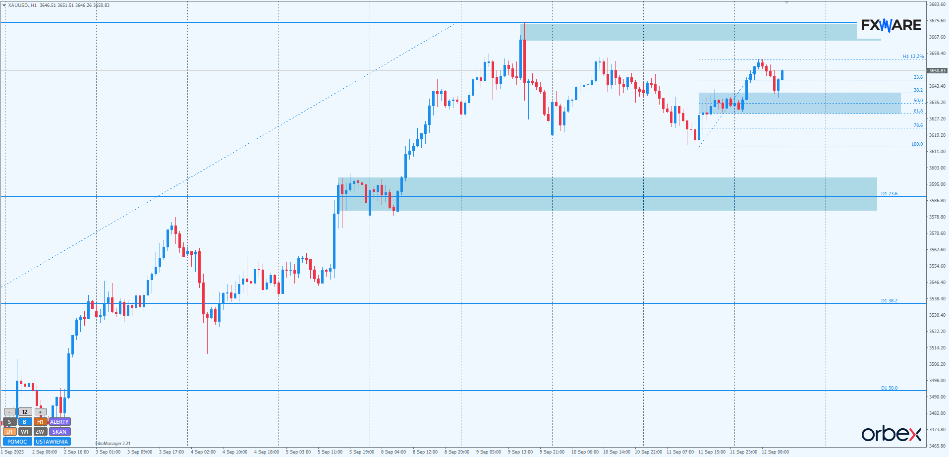 Na wykresie h1 właśnie miała miejsce obrona strefy zniesień fibo swingu mierzonego od wczorajszych minimów. Za 2 h będzie można w pełni oszacować momentum, jakie od poziomu fibo 38,2 uzyskały byki. Na chwilę obecną większe szanse na kontynuowanie swojej sekwencji ma właśnie popyt. Jest tak z racji impulsowych ruchów z początkiem w strefie zniesień w ich wykonaniu. Tylko wyraźne osłabnięcie w okolicach 3666 i niemożność poprawienia ATH albo nawet niemożność pokonania dzisiejszych szczytów mogłaby sprowokować test strefy konsolidacji z pivotem w okolicach 3590.