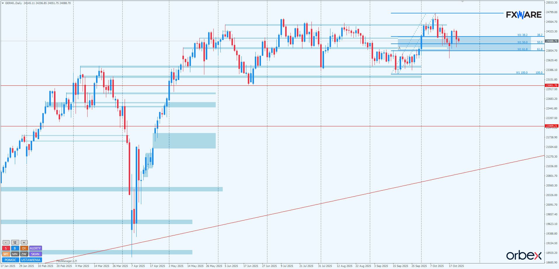 Na wykresie dziennym DAX zapoczątkowany w piątek swing byków przeżywa właśnie pierwsze trudności. Choć poniedziałkowa świeca była imponująca, to kolejne dwie sesje przyniosły odreagowanie. Byki wybroniły się na pivocie strefy zniesień Fibo swingu mierzonego od minimów z września. Podobna obrona miała miejsce wcześniej na ważniejszym poziomie Fibo 61,8. Do końca tygodnia okaże się, czy będzie to wystarczające, by byki kontynuowały ruch w kierunku ATH. Pivot strefy zniesień i SR na RN 24000, jak widać, indukują reakcje popytu – pytanie tylko, czy będzie ona wystarczająco silna, by ustanowić nowy wyższy szczyt w sekwencji rozpoczętej pro wzrostowym pinem kilka dni temu. Gdyby niedźwiedzie zanegowały knota wczorajszej daily i rozpoczęły erodowanie pinbara wyznaczającego październikowe minima, powrót w okolice 23400 i dolnej bandy blisko półrocznej konsolidacji nabrałby prawdopodobieństwa.