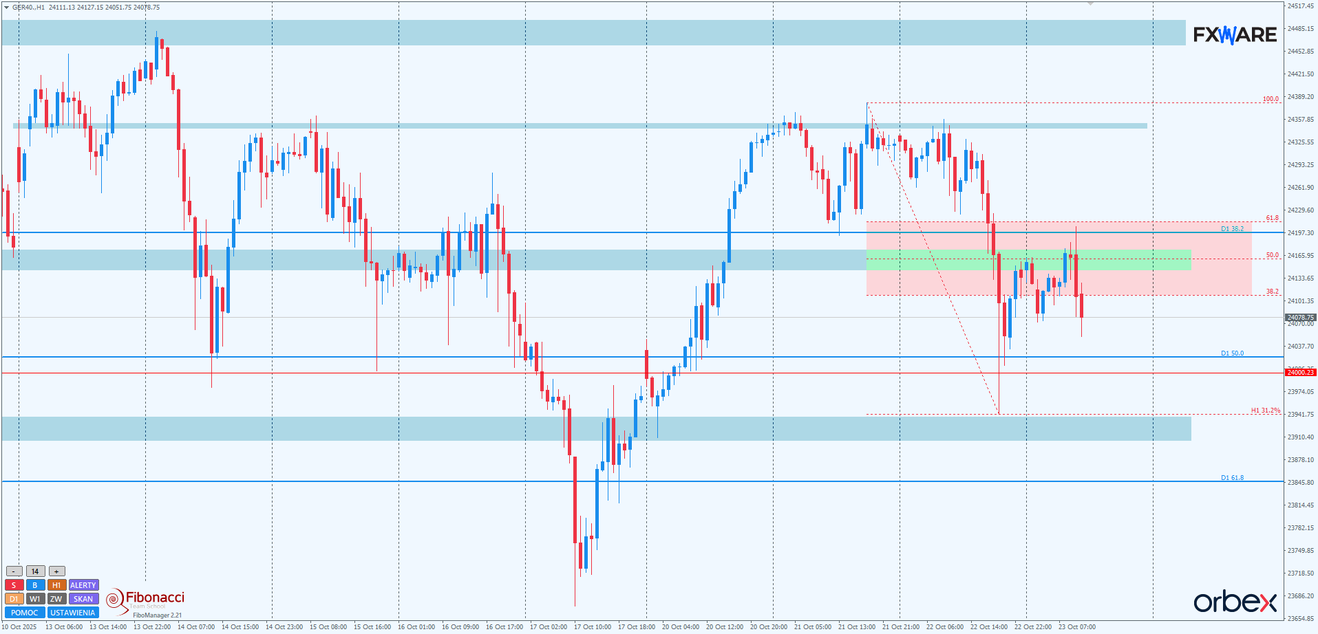 Na wykresie H1, pomimo wysiłku byków, wczoraj powróciło niedźwiedzie momentum. Na przełomie sesji i we wczesnych godzinach porannych miała miejsce wolniejsza korekta. Sekwencja w dół wydaje się być kontynuowana od pivota strefy zniesień Fibo swingu mierzonego od maksimów tego tygodnia. Za kilka godzin będzie już znana reakcja podaży na rejon knota z D1 i RN 24000. Jeśli aktualny rozpęd podaży utrzyma się jeszcze 2-3 godziny, bykom będzie bardzo trudno przeciwdziałać takiej sekwencji niższych szczytów i dołków z ruchami impulsowymi w dół. Wtedy uzyskanie zamknięć na H1 poniżej 24000 będzie realne jeszcze na dzisiejszej sesji, a to miałoby konsekwencje z punktu widzenia PA nawet na wyższych TF.