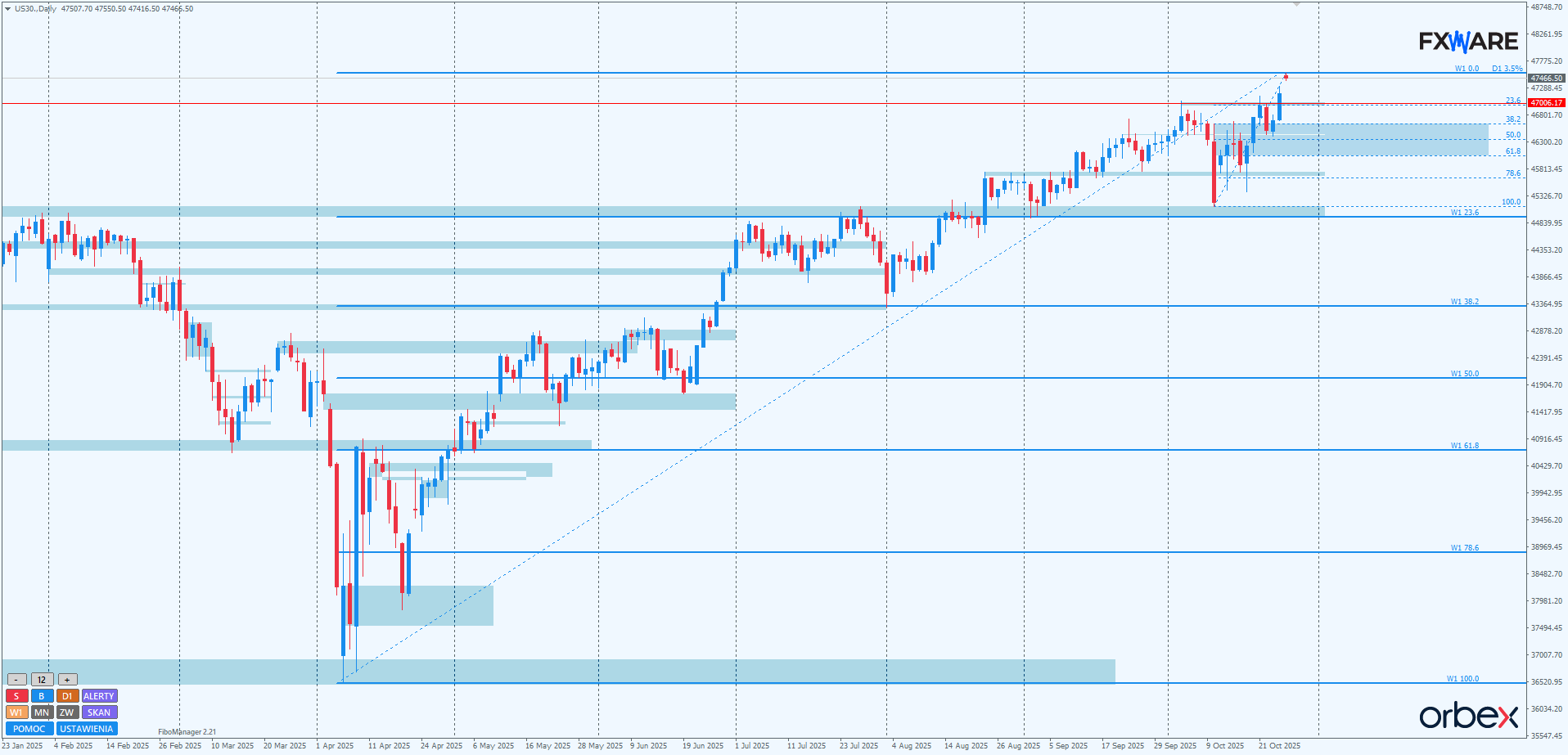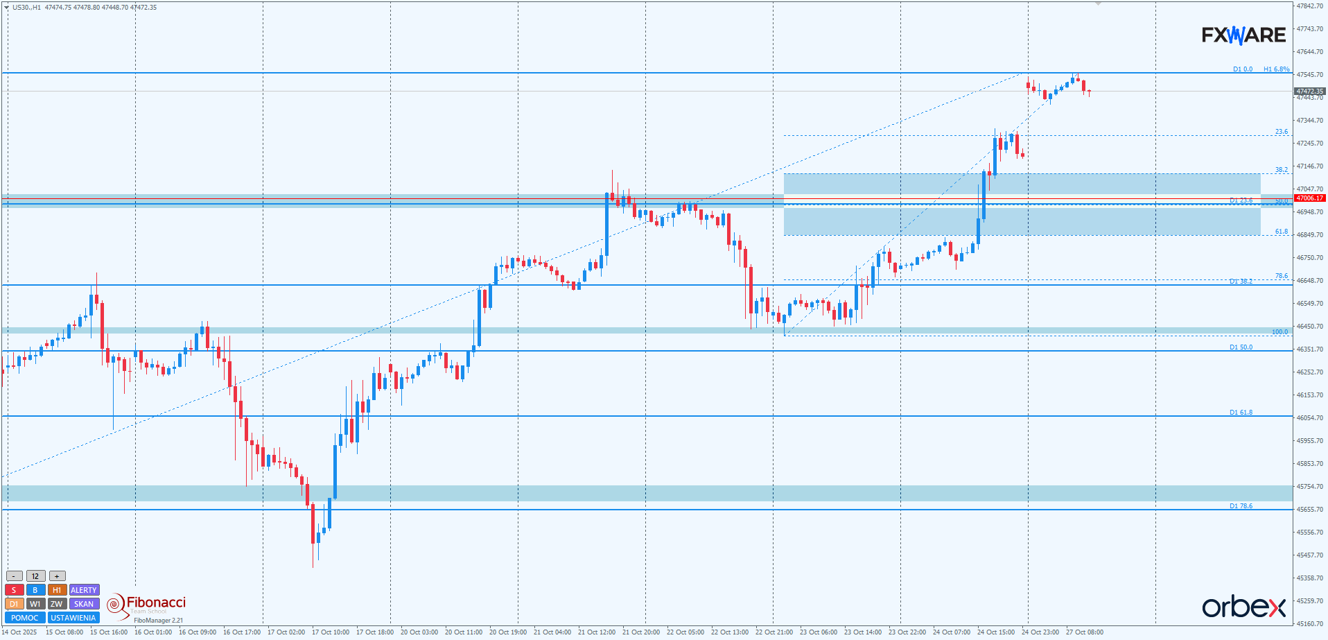 Na H1 piątkowy szybki impuls, jak na razie, poza samą luką otwarcia, nie jest kontynuowany. Wczesnoporanne lekkie osunięcie wyceny indeksu nie doczekało się nowego impulsu. Ruch w górę przez kilka godzin był wręcz na tyle mizerny, że nie będzie niczym niezwykłym, jeśli w ciągu dzisiejszej sesji niedźwiedzie zdecydują się na wejście w obszar luki, a nawet test górnych rejonów strefy zniesień fibo swingu mierzonego od minimów z czwartku. Sporo będzie zależeć od rozpędu podaży w ewentualnej korekcie. Słabe momentum i niemożność pokonania RN 47000 przez kilkanaście godzin usadowią byki w komfortowej sytuacji do rysowania kolejnego impulsu na nowe ATH. Silne momentum ruchu w dół może być prekursorem dłuższego swingu, który na wyższych TF będzie false breakiem RN 47000.
