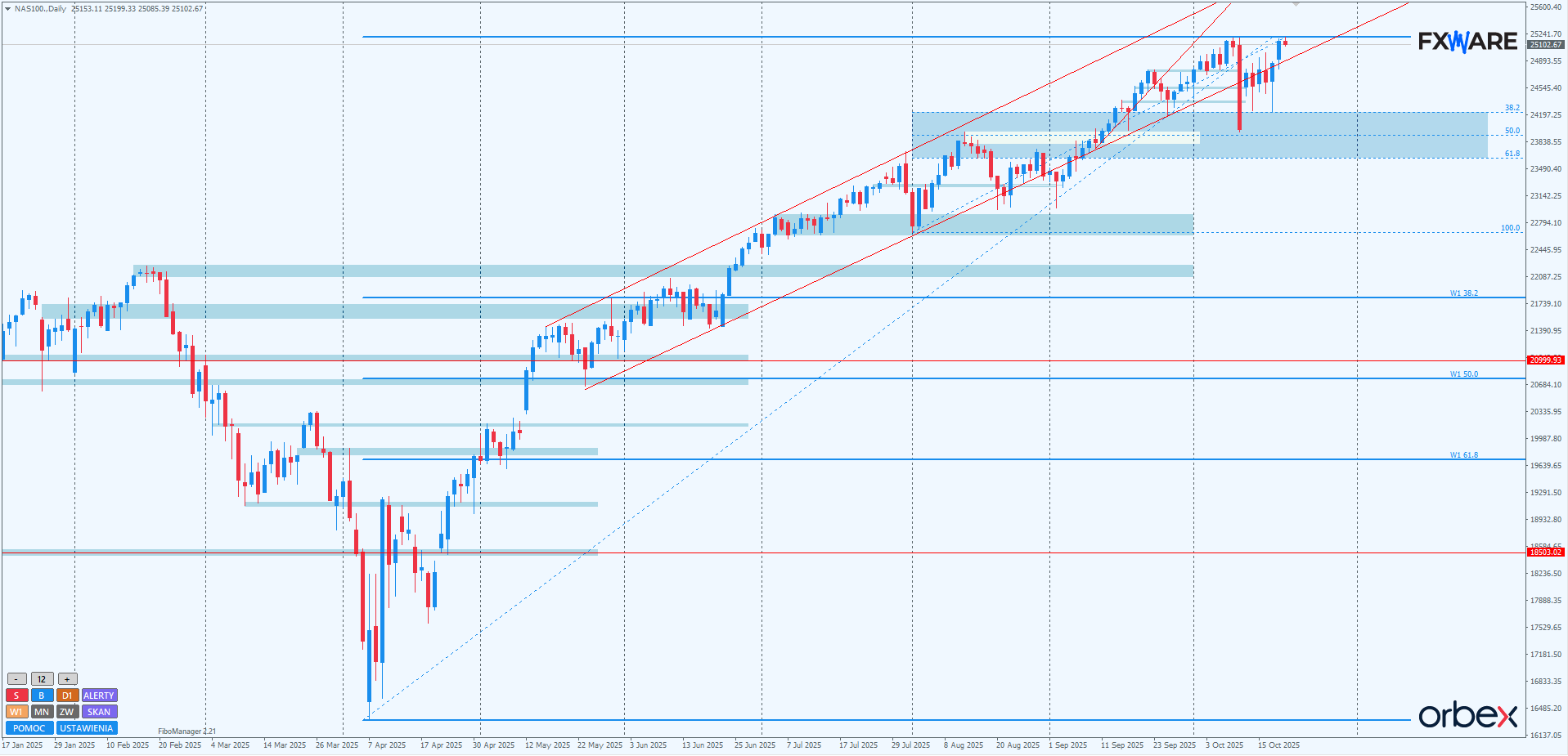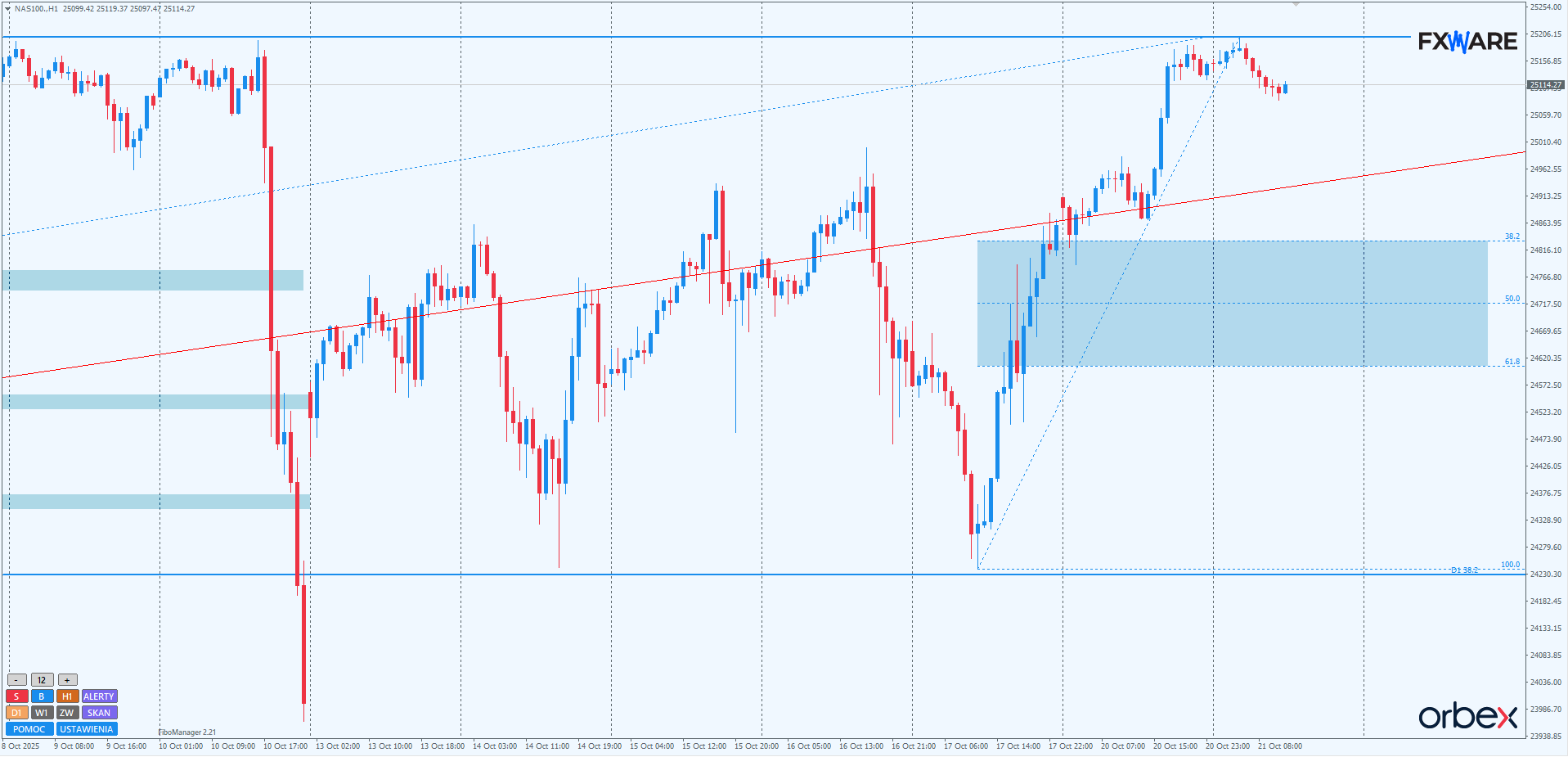 Gdyby jednak doszło do przełamania od góry 25100, rozciągający się poniżej aż do 24970 obszar fair value gap mógłby spowodować akcelerację spadków w ramach dzisiejszej sesji. W takim scenariuszu dotarcie w rejon 24860 nie byłoby niczym niezwykłym. Niedaleko leży też najwyższy poziom Fibo strefy zniesień swingu mierzonego od czubka wspomnianego V-shapeda z piątku. Są to pierwsze interesujące dla spóźnionych byków poziomy, na których można spodziewać się ich większej aktywności.