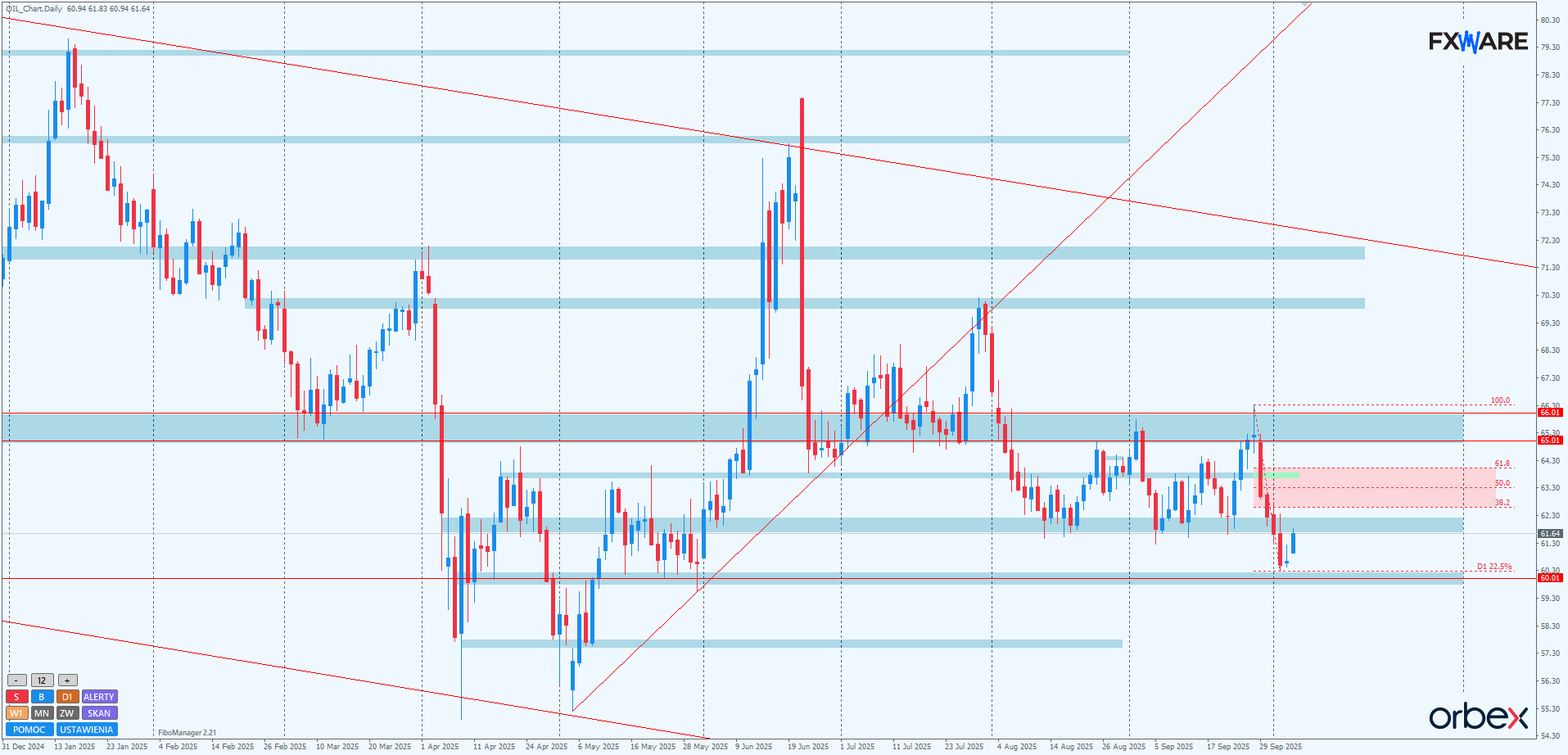 Na wykresie dziennym ropy naftowej WTI niedźwiedziom udało się po blisko 2 miesiącach prób przebić przez SR 62$. Stanowił on dolne ograniczenie konsolidacji rozpoczętej przebiciem od góry rejonu 65-66$ na początku sierpnia. Ostatni false break na tym poziomie w formie pro spadkowego pinbara tak rozpędził podaż, że na pokonanie szerokości konsolidacji potrzebowała tylko 3 sesji. Do psychologicznego RN 60$ za baryłkę dotarła w jeden dzień. Trwa aktualnie ruch w górę w kierunku 62$, by zretestować dolne ograniczenie tej 2-miesięcznej konsolidacji od dołu. Od odpowiedzi niedźwiedzi będzie zależało, czy ostatnie 2 sesje to tylko false breakowa wycieczka, czy swing będzie kontynuowany. Na pewno niedźwiedzie uzyskały cenną zdobycz z punktu widzenia blisko 4-miesięcznego trendu spadkowego – udało im się ustanowić nowy, niższy dołek. W tej sytuacji nawet kilka dni korekty głębiej wchodzącej w strefę zniesień fibo swingu mierzonego do ostatniego pina w rejonie 65-66$ nie powinno być dla podaży niepokojące.