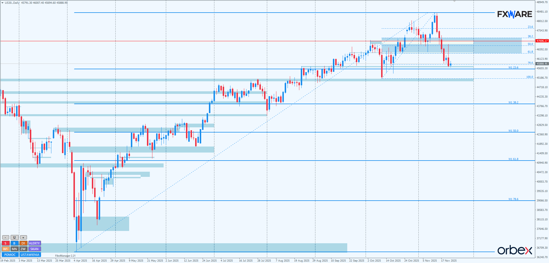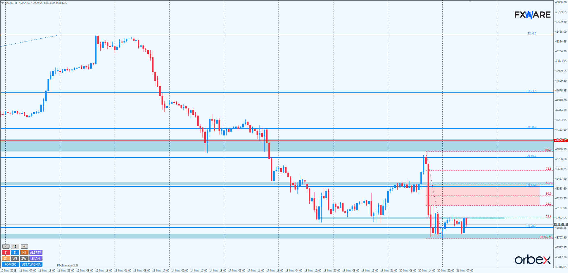 Na h1 byki mają problem z pokonaniem lokalnego SR 45965. Leży tam fibo 23,6 swingu mierzonego od początku wczorajszego mini tąpnięcia. Nie jest to jakiś kluczowy poziom. Dlatego nawet w scenariuszu dalszych spadków nie będzie niczym niezwykłym, jeśli byki dotrą jeszcze na dzisiejszej sesji w strefę zniesień fibo wspomnianego tąpnięcia i osiągną jego pivot czy nawet fibo 61,8. O ile nastąpi to na mniejszym momentum niż wczorajsza mocna akcja podaży, nie przysporzy to niedźwiedziom poważnych problemów. Cała kilkudniowa sekwencja spadkowa nie jest zagrożona. Okolice 46300 są również korzystne dla pragnących podłączyć się pod kolejną falę spadków niedźwiedzi. Gdyby okazało się, że na RN 45700 wytworzy się double bottom, a bykom udałoby się, wykorzystując wczorajszy FVG, uzyskać jakieś zamknięcia powyżej 46400, mogłoby to być prekursorem do zmiany sytuacji na ponownie korzystną dla popytu. Jest to jednak na chwilę obecną mniej prawdopodobne.