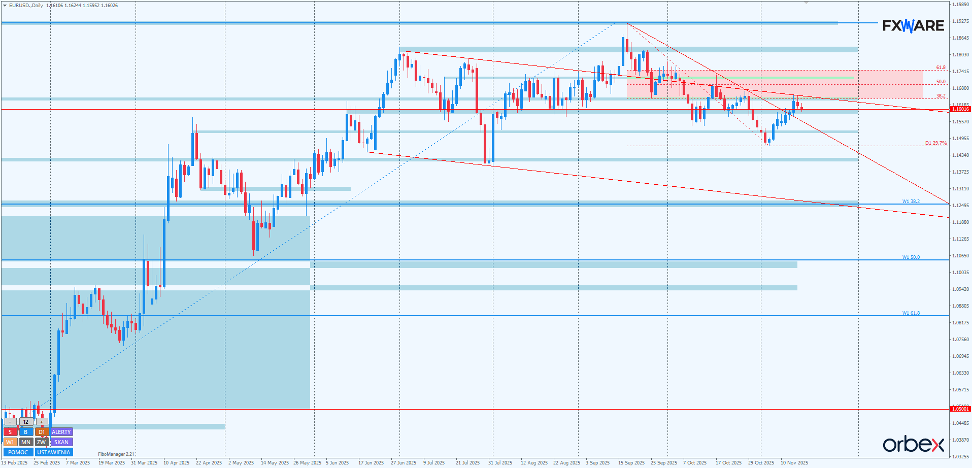 Brak mobilizacji byków w tym istotnym miejscu może się skończyć kolejnym impulsem podaży w ramach trendu trwającego od blisko 2 miesięcy. I choć już niebezpiecznie nadwyrężonego przez byki, szczególnie przyspieszeniem w czwartek ponad 1.16, to wciąż zachowującego strukturę niższych dołków i niższych szczytów.