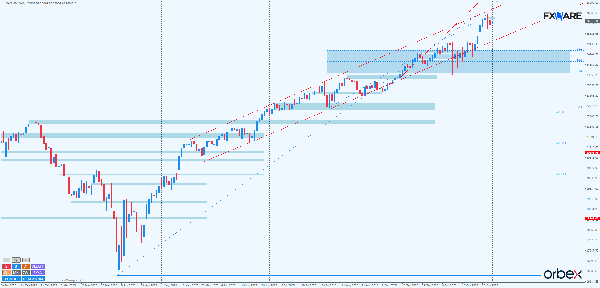 Na wykresie dziennym NASDAQ trwa kompensowanie silnego impulsu z ubiegłego tygodnia. Przebicie poprzednich ATH na sporym momentum, pro wzrostowa luka otwarcia i całościowo silny impuls. To czynniki, które ukształtowały ostatni ruch w górę. Nic dziwnego, że w obliczu jego jednoznaczności odpowiedź podaży jest niepewna i niemrawa. Nie jest wykluczone, że jeśli niedźwiedzie bardziej się nie zmobilizują, to nowe ATH zostanie ustanowione bez retestowania od góry strefy luki i szczytów double topa z października. Nowe ATH miałoby też szansę zmierzyć się z górną bandą kanału obowiązującego od pół roku. Tempo jego pokonywania oraz ewentualna siła reakcji na nim dałyby sporo informacji odnośnie kondycji byków po wysiłku ubiegłego tygodnia. Jak na razie, dopóki niedźwiedzie nie zdobędą zamknięcia daily poniżej 25700, szanse na pogłębienie korekty są mniejsze niż szanse na nowe szczyty.