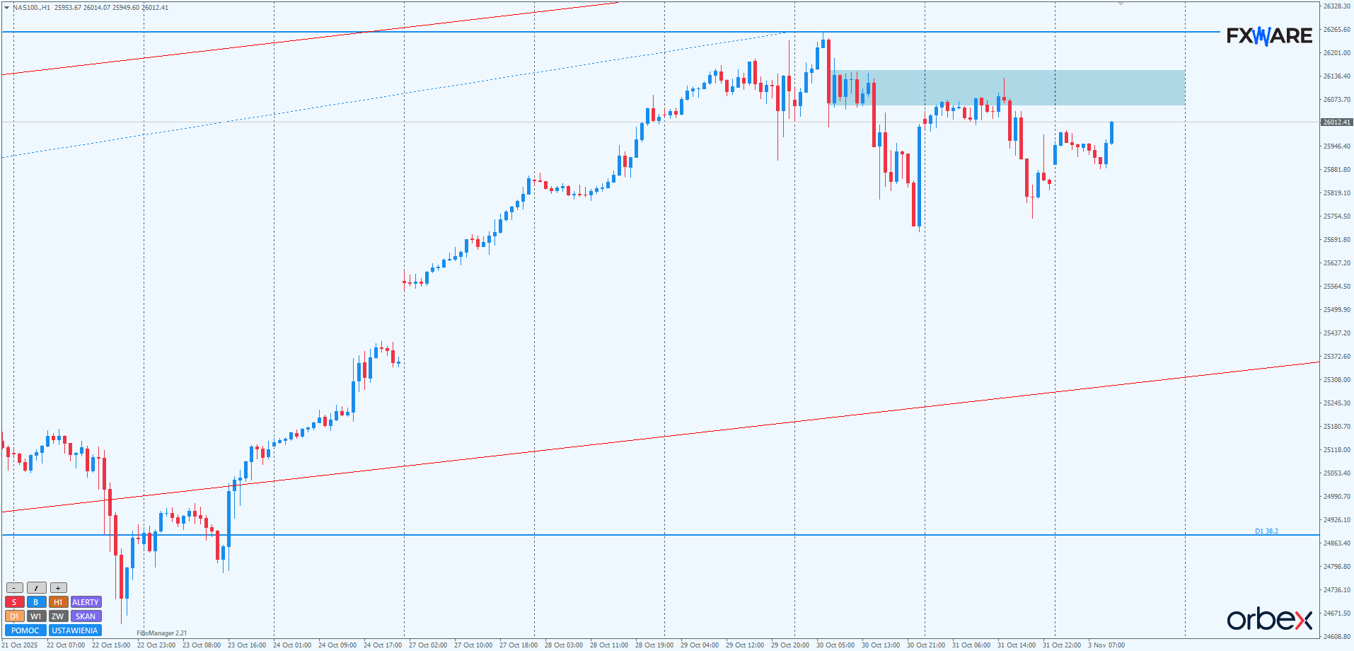 Przebicie tego obszaru na sporym momentum praktycznie przesądzi o ponownym ataku na ATH. Jeśli pojawią się tam problemy, cały swing w górę widoczny na D1 może w konsekwencji doznać sporego spowolnienia. Jednak dopiero gwałtowna reakcja podaży i powrót w zaledwie kilka godzin w rejony 26000 zmieniłyby krótkoterminowy obraz sytuacji ponownie na korzystny dla niedźwiedzi. Spadki na słabym momentum, w obliczu rozpędu aktualnego swingu w górę, raczej zachęcą tylko spóźnione byki do dalszych longów.