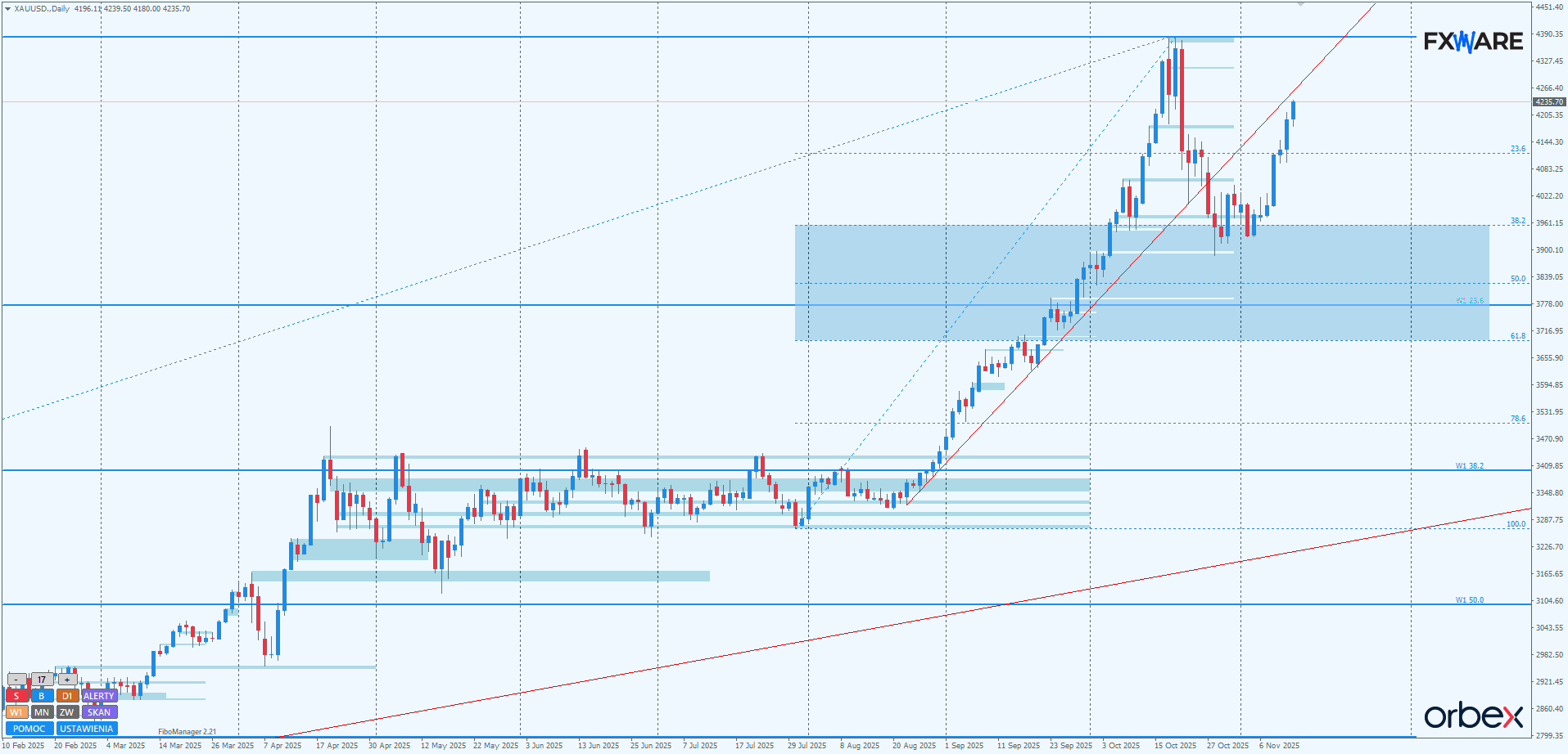 Na wykresie dziennym XAUUSD trwa szybki swing wzrostowy korygujący pierwszą falę spadków w dwumiesięcznym trendzie zapoczątkowanym na konsolidacji pod koniec sierpnia. Już pierwszy poziom Fibo 38,2 okazał się wystarczający do zatrzymania rozpędzonych niedźwiedzi. I choć byki potrzebowały jeszcze jednego retestu tego poziomu Fibo na początku listopada, to od kilku dni wyraźnie dominują. Udało im się bez większych problemów pokonać lokalne SR na 4062 i 4180, gładko przejść przez strefę luki otwarcia sprzed 2 tygodni i wykorzystać obszar fair value gap utworzony zaraz po tąpnięciu od ostatniego ATH. I to wszystko w jednym, jednorodnym swingu.