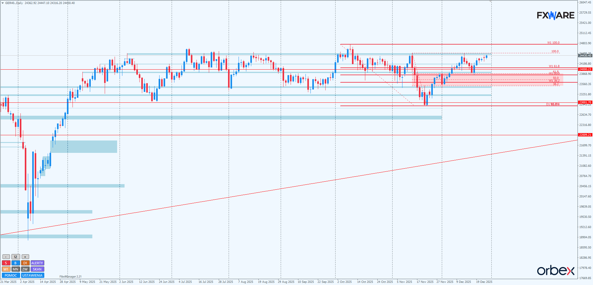 Na wykresie dziennym DAX średnioterminowa sytuacja niewiele zmieniła się przez ostatni tydzień. Byki co prawda ponownie dotarły do SR na RN 24500, ale znów na niewielkim rozpędzie. Daje to ponownie szansę niedźwiedziom na reakcję od tego SR, który również w grudniu spełnia zadanie górnej bandy już 8-miesięcznej konsolidacji. Aktualnie trwa próba zanegowania knota inside-bara z 12.12.25. Gdyby dziś lub jutro bykom udało się świecą ze sporym body zamknąć ponad wspomnianym SR, uczyniłoby to z niego istotne wsparcie na najbliższe dni. Mocno też ułatwiłoby takie wysokie zamknięcie atak na ATH. Zostałby również wyrysowany nowy wyższy szczyt w półtoramiesięcznym trendzie wzrostowym. Ogólnie byłoby to cenne zwycięstwo popytu w kategoriach PA.