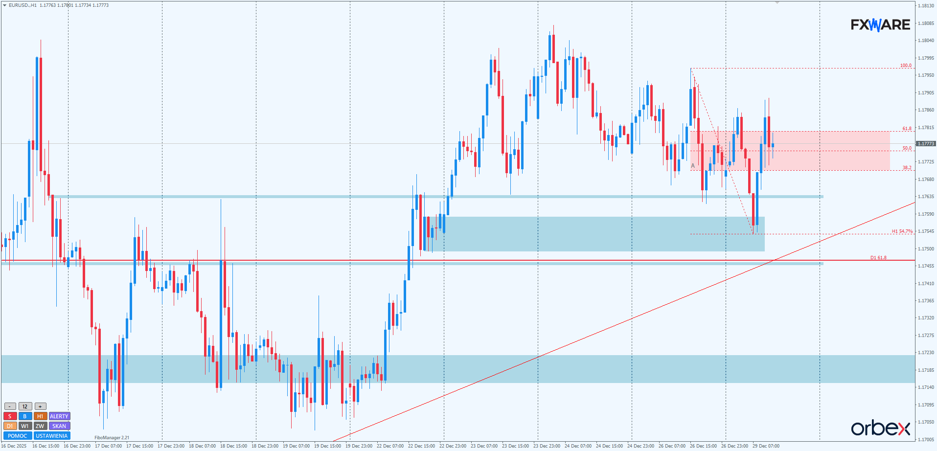Na H1 od rana zdążył wyrysować się V-shaped reversal. Dobitnie pokazuje on, że byki myślą poważnie o zakończeniu 3-sesyjnej korekty rozpoczętego w zeszły poniedziałek impulsu. Najbliższe godziny dostarczą cennych informacji na temat potencjału byków w najbliższych dniach. Kilka, a nawet kilkanaście godzin korekty i powolne zejście w okolice lokalnego SR na 1.17630 nie będzie dla nich żadnym zagrożeniem. Umożliwi dalsze sprawne rysowanie kolejnego impulsu w górę. Gdyby jednak spadki nastąpiły szybko i pogłębiły się poza wspomniany wyżej lokalny SR, cała kilkusesyjna korekta mogłaby się znacząco wydłużyć i odwiedzenie przez niedźwiedzie strefy konsolidacji na 1.17500 byłoby realne jeszcze nawet dzisiaj lub jutro. Nie przekreślałoby to szans byków na impuls w najbliższych dniach, ale spowodowałoby, że aktualna korekta zyskałaby w swojej sekwencji jeszcze jeden niższy dołek, a stary poziom fibo 61,8 z pomiaru dziennego uzyskałby retest od góry zgodnie z ZZB.