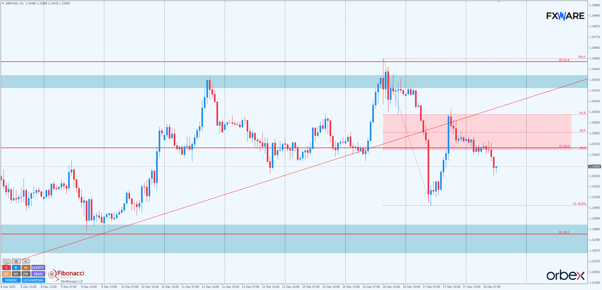 Na wykresie dziennym GBPUSD wczoraj doszło do nieudanej próby wyłamania z blisko miesięcznego trendu wzrostowego. Byki już wcześniej miały trudności z pokonaniem poziomu fibo 61,8 strefy zniesień swingu mierzonego od wrześniowych szczytów. Pierwsza próba z 11.12 zakończyła się pro spadkowym pinbarem. Kolejna z 16.12, choć nie w formie pinbara, to mimo wszystko nad fibo 61,8 i 1.34330 wyprowadziła tylko knot. Reakcja podaży na kolejne zetknięcie ze wspomnianymi okolicami tym razem była dużo silniejsza i niedźwiedzie wyprowadziły kurs kabla poniżej LT wspomnianej sekwencji wzrostowej. Do końca sesji jednak byki zdołały się zmobilizować i finalnie tylko knot świecy daily wychodzi poza LT, a to nie jest jeszcze sygnałem jednoznacznym.