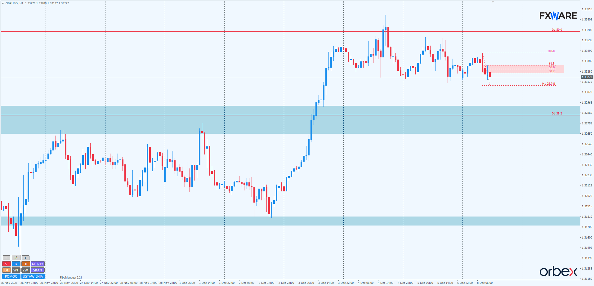 Na h1 po przeciągnięciu na SR 1.33700 trwa korekta ostatniego wysiłku byków. Da się wyraźnie zauważyć czwartkowe i piątkowe impulsy podaży, a także zanegowanie ostatniego prowzrostowego pina z czwartku. W tych okolicznościach nie będzie niczym niezwykłym, gdyby niedźwiedzie zeszły nawet do 1.32600. Tam można się będzie spodziewać aktywizacji byków, dla których to korzystne rejony do brania longów. Gdyby impuls byków zaistniał wcześniej to na wyższych TF pozostałby obszar fair value gap, który trzeba by uwzględniać w kolejnych dniach. Jak na razie trwająca korekta wydaje się zupełnie naturalna i niezbyt groźna dla popytu.