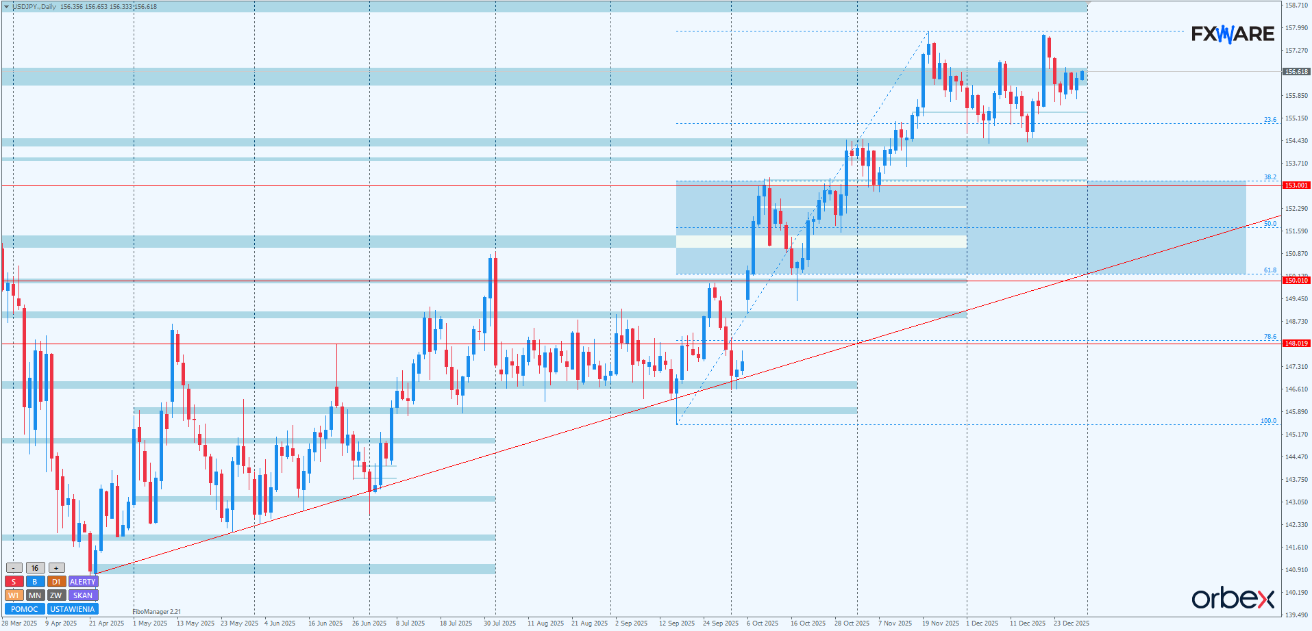 Końcówka roku na jenie upływa jak na razie na nieporadnej próbie zanegowania przez byki double topa ze szczytami z 20 listopada i 19 grudnia. Choć jego prawa strona to cudownie mocny impuls, to korekta podaży okazała się na tyle szybka i głęboka, że byki mają poważny problem z ponownym wystartowaniem na tegoroczne szczyty. Można wręcz zaryzykować stwierdzenie, że o ile byki nie przyspieszą na wykresie D1 tak, by kurs USDJPY osiągnął 157.500 w ciągu 1–2 sesji, to układ momentum będzie bardzo korzystny dla podaży do rysowania szybkiego ruchu w dół.