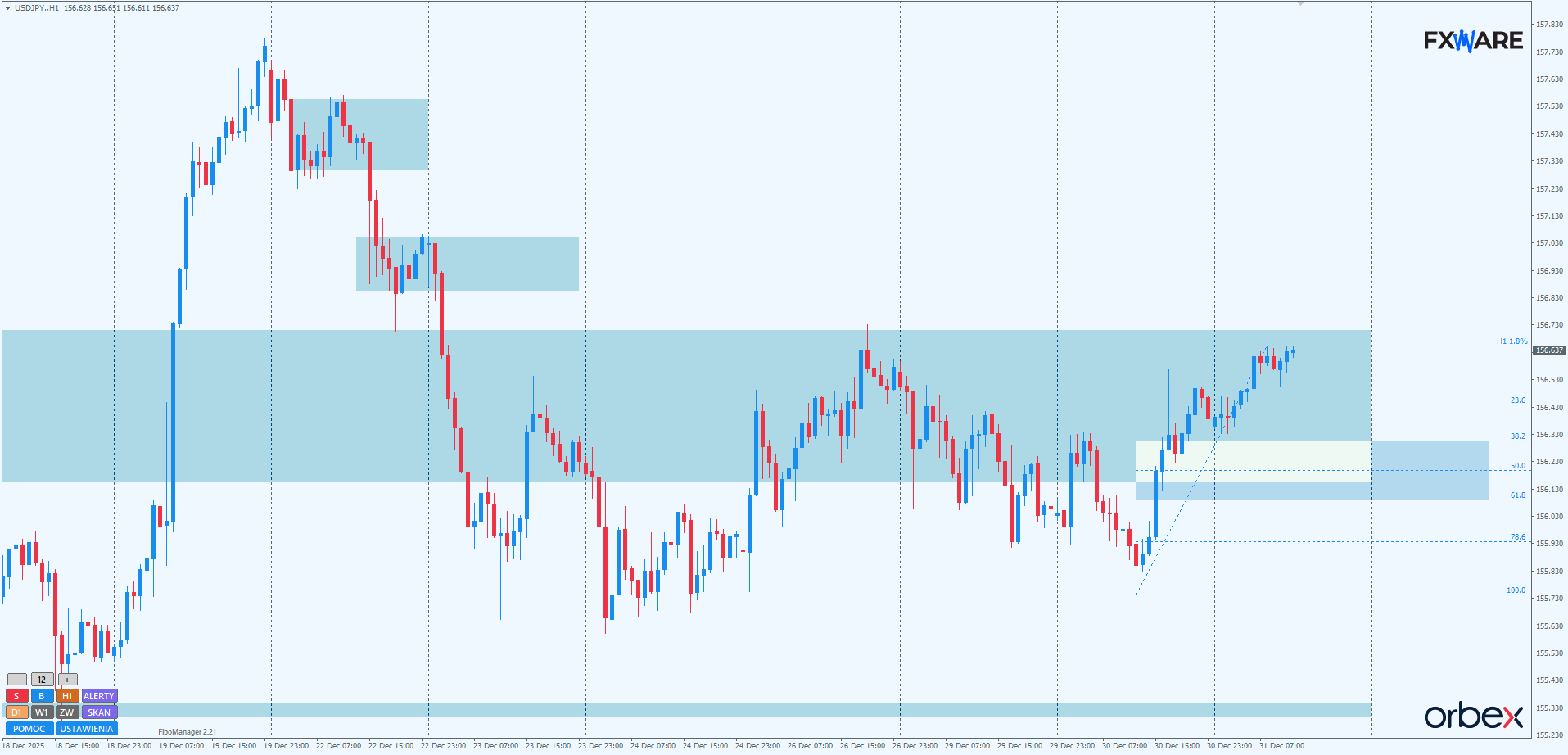 Na H1 od kilku dni panuje relatywnie szeroka, jak na ten TF, konsolidacja. Da się jednak dostrzec w jej ramach delikatną przewagę popytu. Rozpoczęła się ona wyłamaniem struktury korekty 26 grudnia. Podobny pokaz determinacji byków miał miejsce wczoraj. Dzisiaj, jak na razie, ruchy są wolniejsze. Kurs dotarł ponownie w okolice 156.700, które są korzystne dla niedźwiedzi do shortów. Warto pamiętać również o pro spadkowym pinie z wczoraj, który mozolnie i powoli, ale jednak został przez byki zanegowany. Ostatecznie dzisiaj rano, na sporym momentum, szczyt jego knota został pokonany.