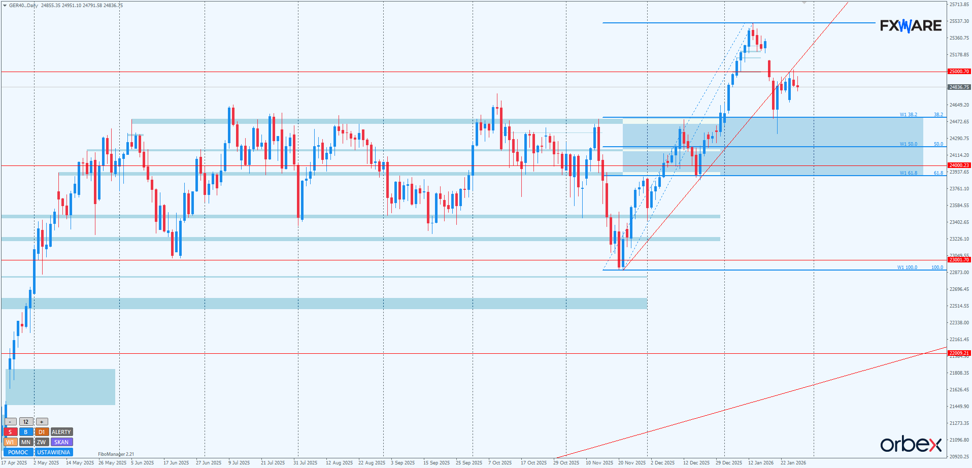 Na H1 konsolidacja staje się bardziej widoczna niż na wyższych TF. Wycena indeksu znajduje się obecnie w okolicach środka luki otwarcia tego tygodnia. Chwilowa przewaga inicjatywy jest po stronie podaży, której udało się wczoraj i dzisiaj wyrysować dwa relatywnie mocne impulsy. Tworzą one od wczorajszego szczytu lokalną klasyczną strukturę spadkową. I jeśli przy dolnej bandzie nie nastąpi typowe dla konsolidacji uaktywnienie się popytu, mocno wzrosną szanse na wybicie dołem jeszcze na dzisiejszej sesji. Sytuacja ponownie na korzystną dla popytu nastąpiłaby tylko wtedy, gdyby byki w kilka godzin uzyskały zamknięcia na H1 ponad 24950. Najlepiej bez poprawiania minimów tego tygodnia. Dałoby to szansę na utrzymanie sekwencji rozpoczętej w zeszłą środę w dotychczasowej formie i uprawdopodobniło impuls z celem nawet na 25300.