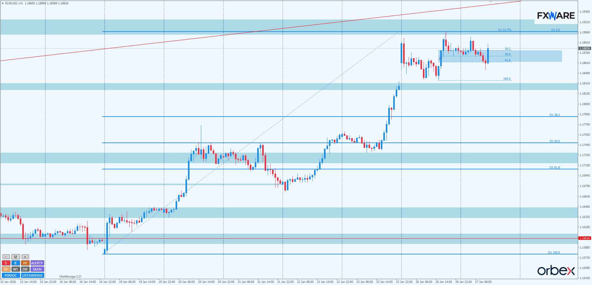Na wykresie dziennym EURUSD trwa mocny wzrostowy swing zapoczątkowany na RN 1.16 19 stycznia. Byki sprawnie przebiły się przez lokalne opory średniej i niskiej wagi i dotarły w okolice RN 1.19. Tam nastąpiła lokalna reakcja podaży, jednak trzeba będzie poczekać jeszcze co najmniej kilkanaście godzin z pełniejszym oszacowaniem jej potencjału. RN 1.19 jest o tyle istotny, że to nie tylko poziom szczytu z 2025, ale poziom rekordu wieloletnich notowań EURUSD. Nie licząc pina z ubiegłego roku dolar był tak słaby ostatnio w 2021 roku. Gdyby byki utrzymały impet i przebiły się ponad niego, stanowiłby cenną zdobycz w kategoriach price action. Retest od góry na niewielkim momentum mógłby zapoczątkować dłuższy swing, który mógłby zagrozić nawet 10-letnim maksimom. Więcej w tej kwestii będzie wiadomo do końca tygodnia, gdy wyjaśni się, czy podaż odpuści górną bandę półrocznej konsolidacji i czy przypadkiem nie mamy do czynienia z false breakiem jak w lipcu czy wrześniu.