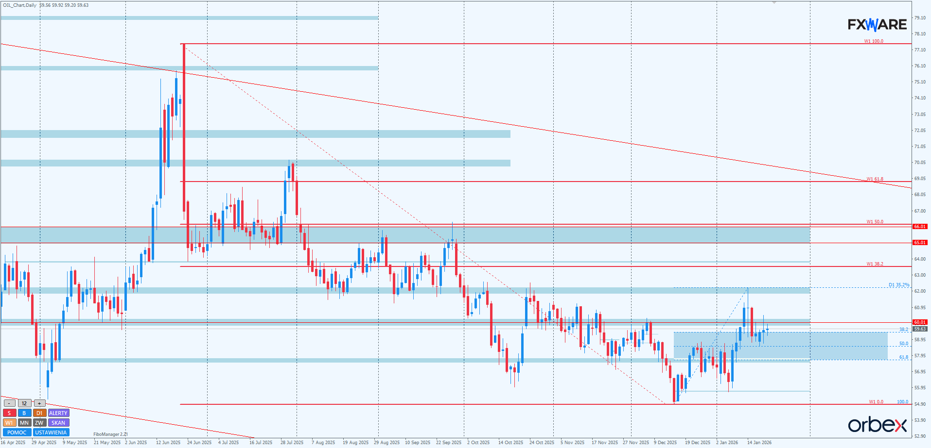 W obecnej sytuacji to podaż ma przewagę i o ile wczorajszy górny knot daily nie zostanie pochłonięty, to niedźwiedzie mają większe szanse na głębsze zejście w strefę zniesień fibo swingu mierzonego od grudniowych minimów. O ile takie zejście będzie powolne, byki znów dostaną szansę na impuls w kierunku 60$ za baryłkę. Natomiast do kontynuowania sekwencji wzrostowej z obecnego miejsca byki musiałyby zanegować wspomniany knot wczorajszego pina i to najlepiej na dzisiejszej sesji. Wtedy odzyskałyby szanse na dłuższy powrót ponad kluczowy ostatnio RN 60$ i wyrysowanie nowego wyższego szczytu w ciągle jeszcze wzrostowej sekwencji od połowy grudnia.