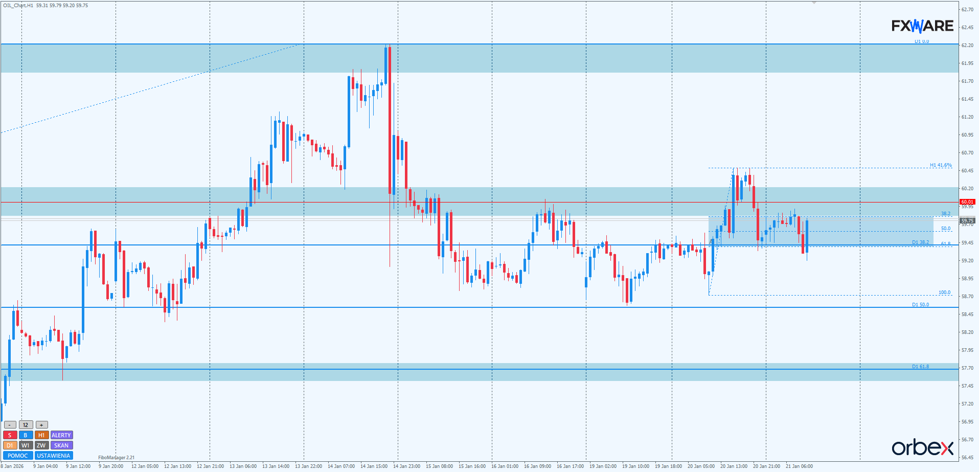 Na H1 krótkoterminowa sytuacja nie jest tak jednoznacznie korzystna dla podaży. Co prawda również widać, że wczorajsze wyjście ponad RN 60$ było false breakiem i ruch powrotny miał spory rozpęd, ale mimo wszystko sekwencja od początku tygodnia nie została jeszcze wyłamana, a pivot zeszłotygodniowej konsolidacji i leżący blisko niego fibo 38,2 z pomiaru dziennego zdają się mieć ciągle działanie odpychające na niedźwiedzie. Sytuacja powinna się wyklarować już za kilka godzin. Utrzymanie się w tym czasie poniżej RN 60$ bez żadnych ekscesów powinno umożliwić podaży rysowanie wkrótce kolejnego impulsu. Tylko szybki powrót ponad RN 60$ i uzyskanie zamknięć na H1 ponad nim dałoby bykom szansę na zanegowanie wczorajszego falsa i umożliwiło dalsze wzrosty w perspektywie kilkudziesięciu godzin.