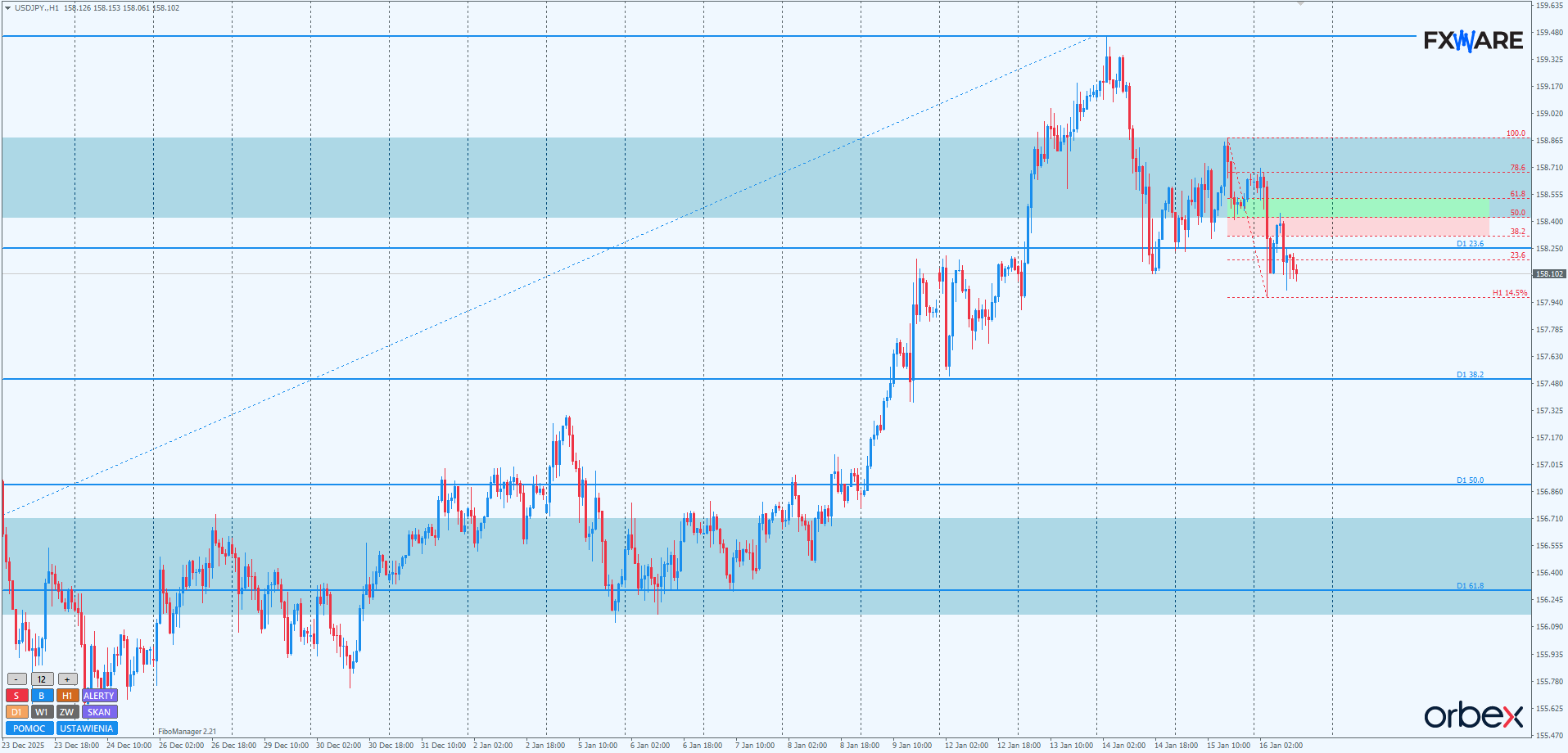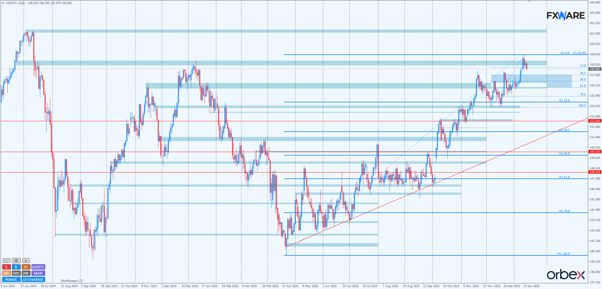 Na wykresie dziennym USDJPY doszło do przełamania potencjalnego double topa ze szczytami w połowie listopada i grudnia. Niedźwiedzie nie wykorzystały bardzo dogodnych dla siebie warunków pod względem momentum do wyrysowania nowego impulsu w dół. Dający jeszcze szansę na ruch spadkowy pin bar z 5.01 został bezpardonowo pochłonięty świecą daily z 9.01. Jeszcze tym samym impulsem byki pokonały SR 158.700. Tym samym poprawione zostały maksima z całego 2025 roku, a byki są na jak najlepszej drodze do nowego ATH kursu USDJPY. Pomiędzy miejscem, gdzie aktualnie znajduje się cena, a SR 161.750 znajduje się już tylko obszar fair value gap z lipca 2024.
