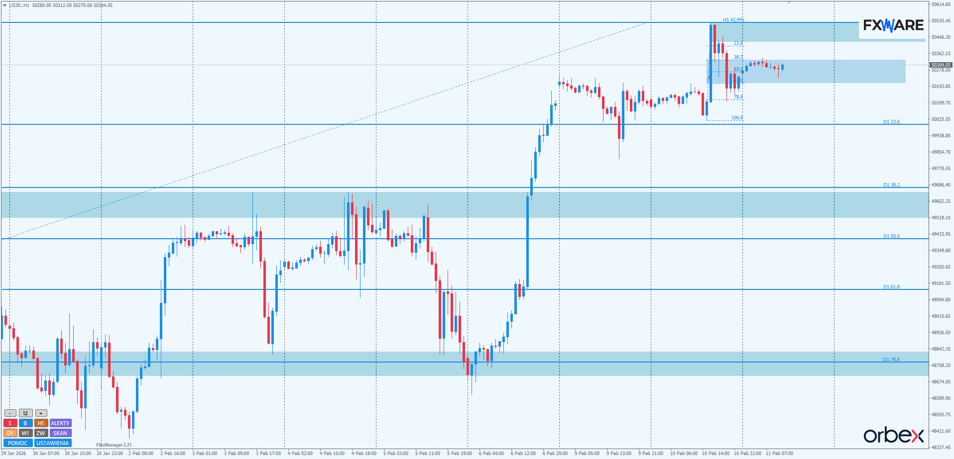 Na h1 ostatni impuls ustanawiający ATH jeszcze wczoraj został skompensowany. Podaż nie weszła z wyceną indeksu nawet w strefę konsolidacji, z której wspomniany impuls się rozpoczął. Jednak następne kilkanaście godzin w wykonaniu byków było już mocno rozczarowujące pod względem momentum. Nie wykluczone więc, że przed próbą ustanowienia nowego ATH korekta się pogłębi, a od góry będzie retestowany SR 49600. Nawet głębsza korekta naruszająca leżący jeszcze niżej obszar FVG z piątku nie byłaby niczym niezwykłym. O ile nie odbyłoby się to na momentum porównywalnym z piątkowym impulsem, ruch taki wpisałby się w aktualną strukturę jako normalna korekta. Nie stanowiłby poważniejszego zagrożenia dla kilkudniowej sekwencji byków. Ustanowiłby po prostu jej nowy wyższy dołek. Same okolice 49600 są optymalne dla spóźnionych byków do ponownych longów, o ile korekta doprowadziłaby wycenę indeksu w te okolice.