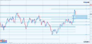 Na wykresie dziennym GBPUSD czwartą sesję trwa korekta impulsu z połowy stycznia. Podaż właśnie zmaga się z pierwszym poziomem fibo 38,2 strefy zniesień wspomnianego impulsu. Jeśli 38,2 okaże się poziomem, na którym zmobilizują się ponownie byki, potrzeba będzie 2–3 sesji, by dokładniej oszacować momentum i szanse byków na wyrysowanie nowego wyższego szczytu już z tego miejsca. W przypadku słabego rozpędu głębsze zejście we wspomnianą strefę zniesień zyska na prawdopodobieństwie. Praktycznie już teraz piątkowa świeca daily, bliska w formie marubozu, dodatkowo engulfująca dolne knoty daily ze środy i czwartku, ma na tyle silne momentum, że bykom będzie ciężko odpowiedzieć równie dynamicznie na dzisiejszej sesji. Cały 3-miesięczny trend w górę byków nie jest zagrożony i do momentu przebicia przez podaż fibo 61,8 wspomnianego pomiaru takiego zagrożenia nie będzie. I to pomimo dość silnego momentum, jakie wydają się mieć niedźwiedzie w aktualnym swingu w dół.