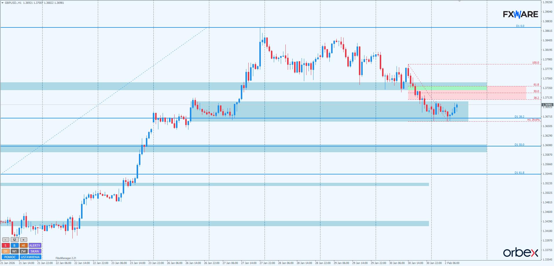 Na H1 w poniedziałkowy poranek cena konsoliduje w obszarze konsolidacji sprzed tygodnia. Pierwsza pod presją będzie górna banda na RN 1.37. Wybicie jej ułatwiłoby bykom rysowanie kolejnego ruchu impulsowego w sekwencji, w której notowania ze środy, czwartku i piątku stanowią korektę wtorkowego impulsu. Wyłamanie się z aktualnej lokalnej sekwencji spadkowej i przebicie SR na 1.37400 to niezbędny warunek zakończenia korekty. Pod względem struktury trendu, układu wyższych szczytów i dołków oraz momentum to miejsce bardzo dogodne dla popytu do takiej akcji. Nie wyrysowanie impulsowego ruchu teraz, za kilkanaście godzin, może być mocno utrudnione. Gdyby doszło do przebicia od góry 1.36600, podaż mogłaby zyskać na momentum, wchodząc w obszar FVG z 23 stycznia.