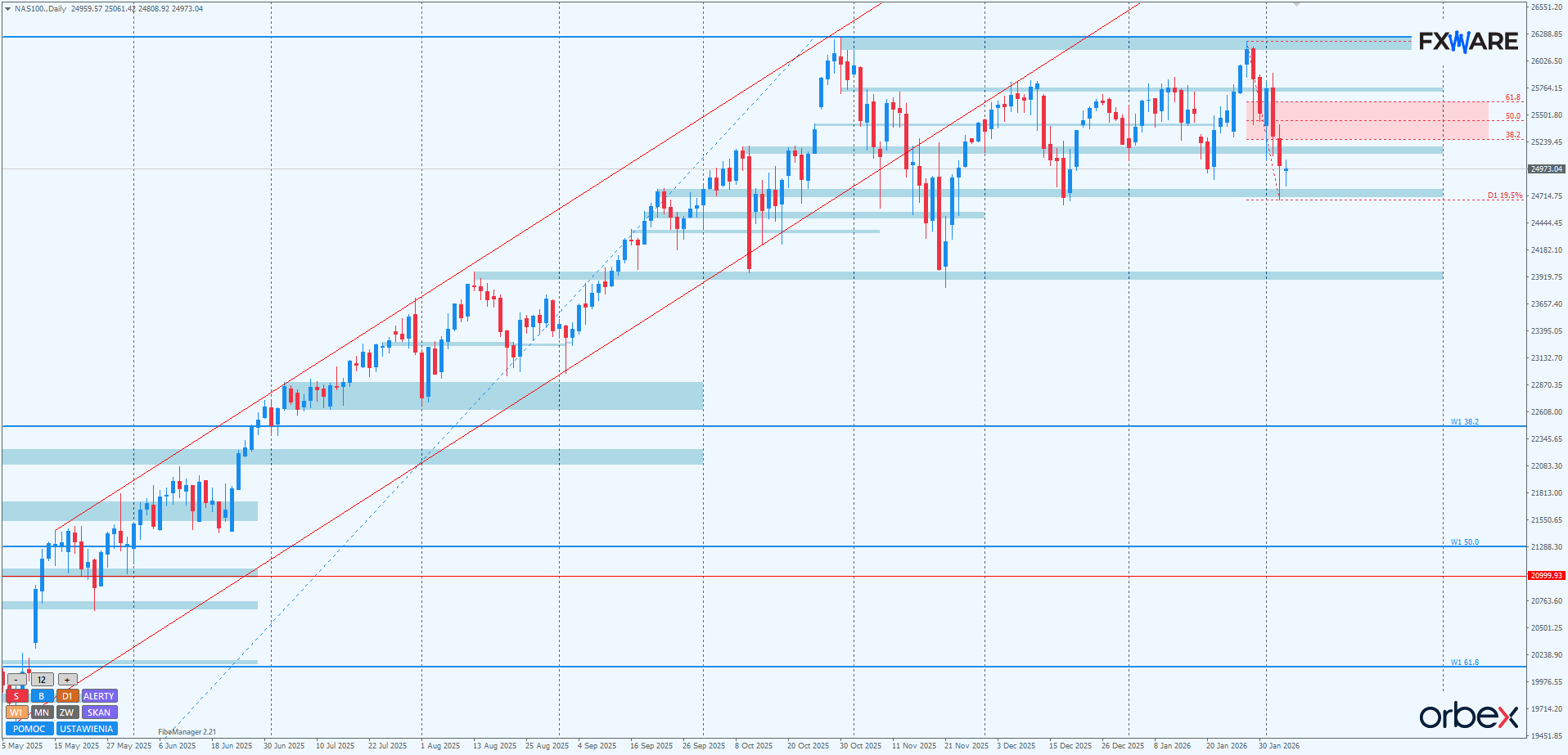 NASDAQ – przyspieszenie w kierunku dolnej bandy konsolidacji